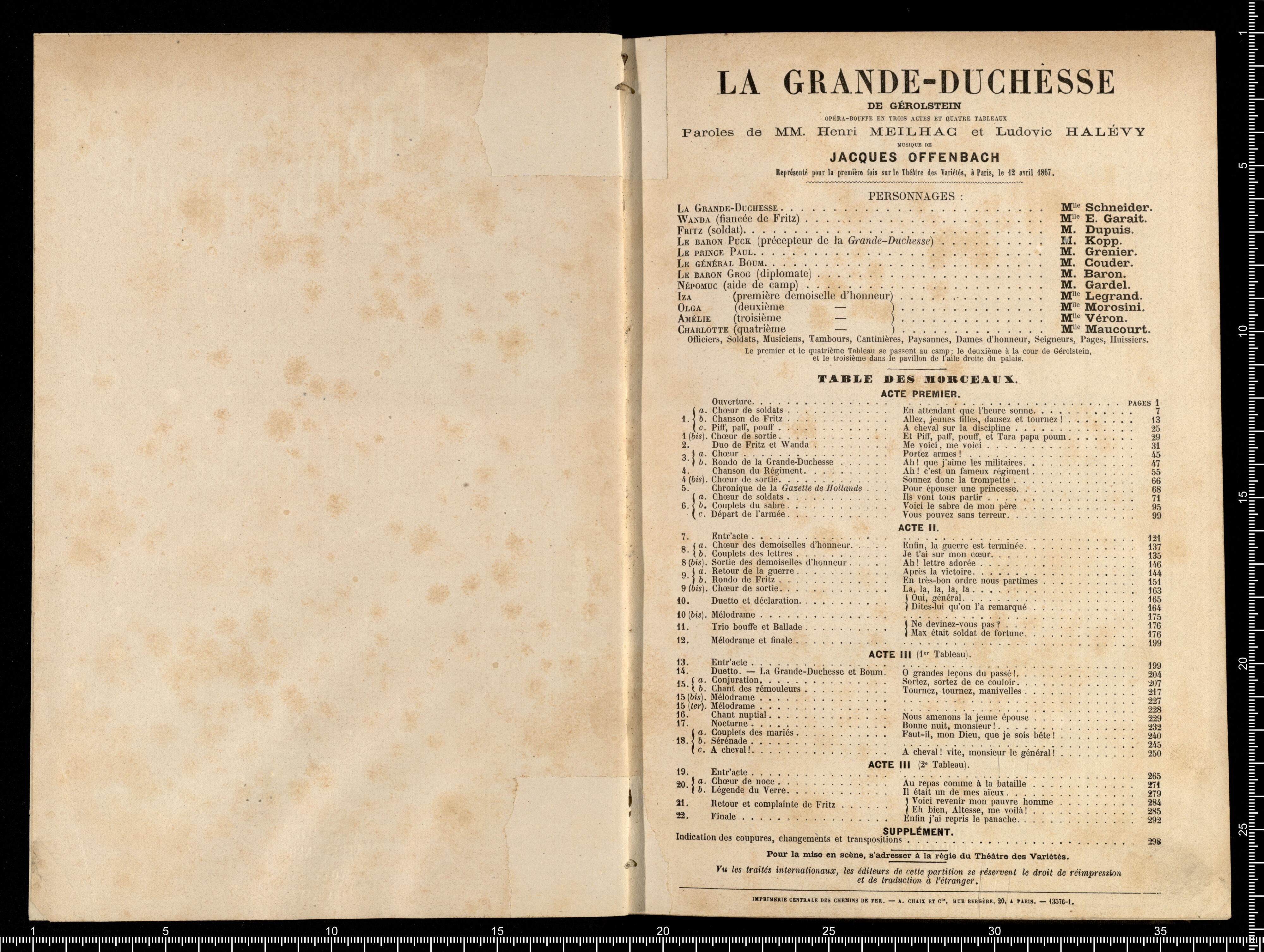 LA | GRANDE DUCHESSE | de | GEROLSTEIN.. | Opéra Bouffe en 3 Actes et 4 Tableaux | Paroles de | Henri MEILHAC et Ludovic HALÉVY. | Musique de | J. Offenbach | Partition Piano et Chant | Arrangee | par Leon ROQUES. | mo Thierry frères Paris Pastelot | Paris | G. BRANDUS & S. DUFOUR | 103, Rue Richelieu. | France et Etranger
