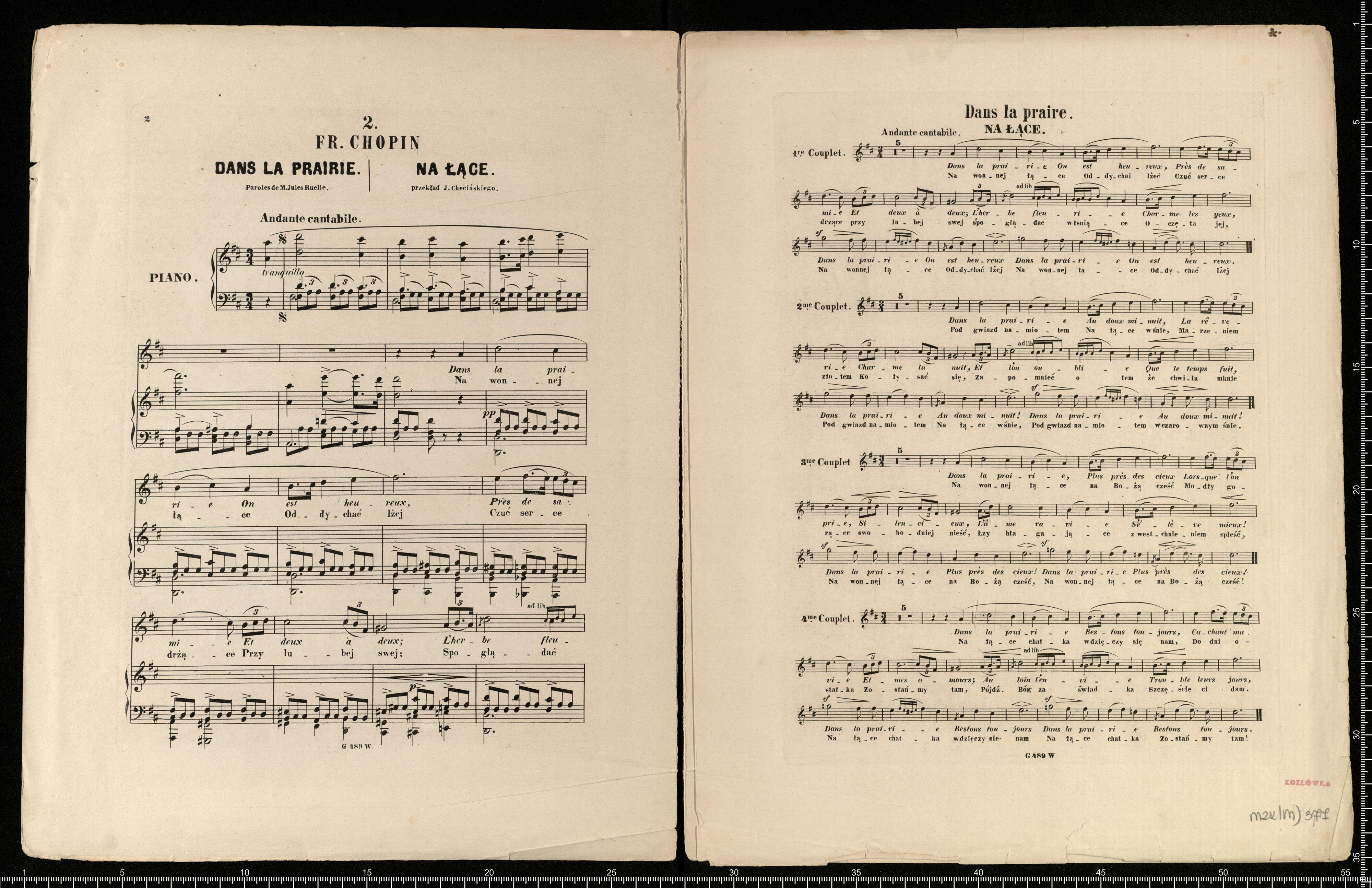 SIX | MÉLODIES | DE | FRÉDÉRIC CHOPIN | transcrites pour | Chant et Piano. | Paroles françaises de M. JULES RUELLE. | Traduction polonaise de J. CHĘCIŃSKI. | [below index of particular pieces along with pricing within the collection] | VARSOVIE, | chez GEBETHNER & WOLFF. | G. 488-493.W
