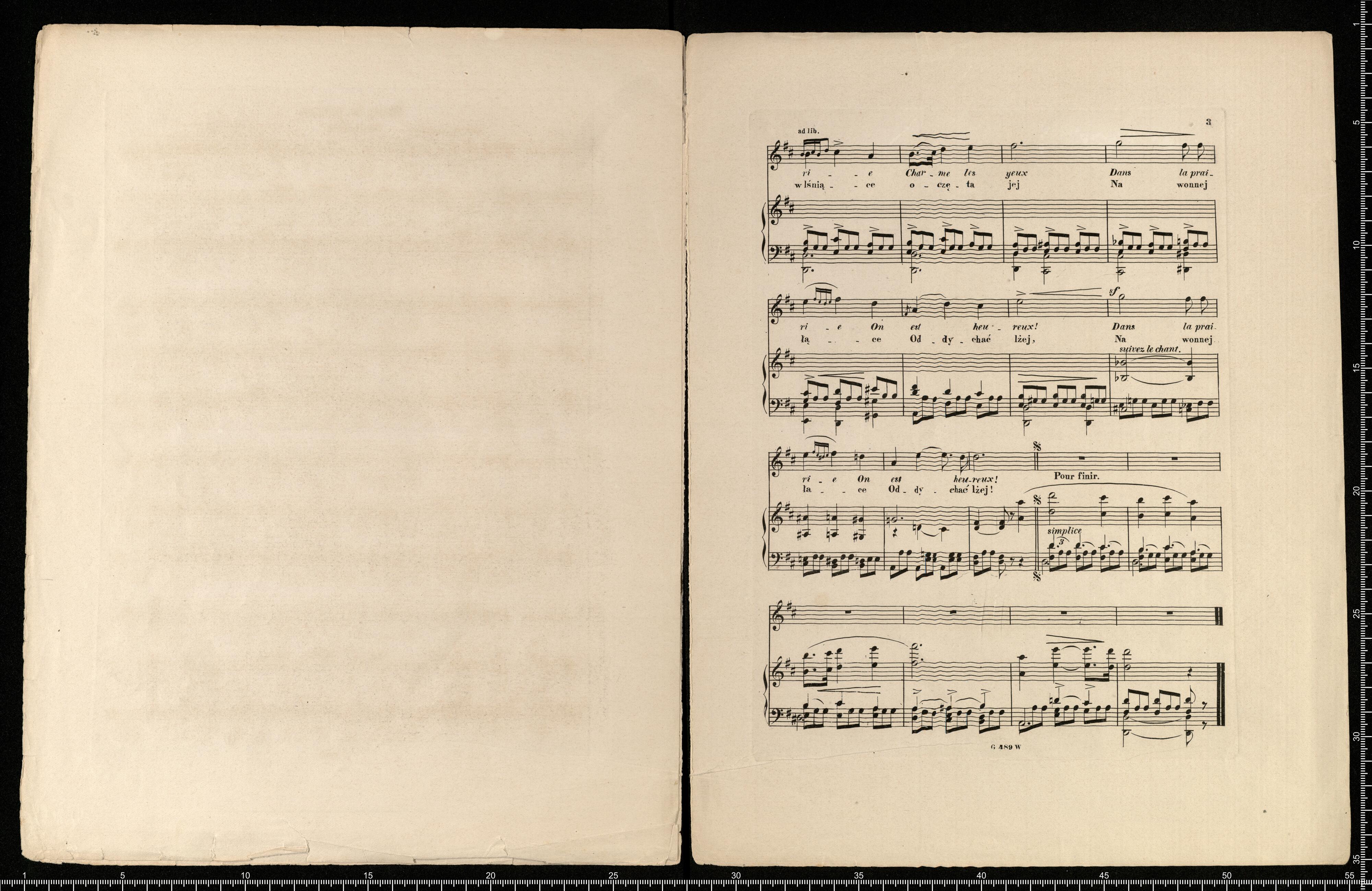 SIX | MÉLODIES | DE | FRÉDÉRIC CHOPIN | transcrites pour | Chant et Piano. | Paroles françaises de M. JULES RUELLE. | Traduction polonaise de J. CHĘCIŃSKI. | [below index of particular pieces along with pricing within the collection] | VARSOVIE, | chez GEBETHNER & WOLFF. | G. 488-493.W