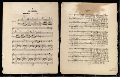 SIX | MÉLODIES | DE | FRÉDÉRIC CHOPIN | transcrites pour | Chant et Piano. | Paroles françaises de M. JULES RUELLE. | Traduction polonaise de J. CHĘCIŃSKI. | [below index of particular pieces along with pricing within the collection] | VARSOVIE, | chez GEBETHNER & WOLFF. | G. 488-493.W, Plainte V, pf