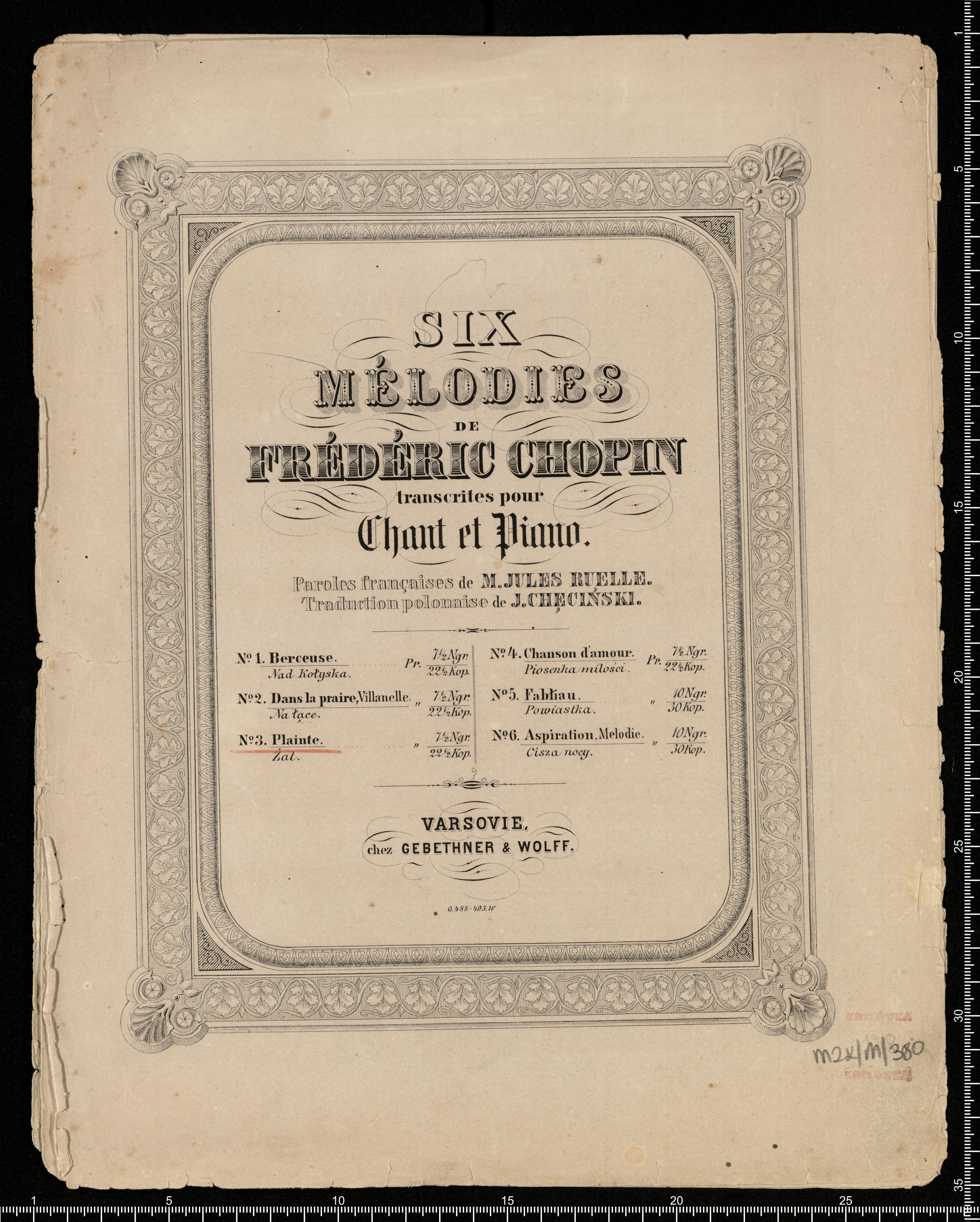 SIX | MÉLODIES | DE | FRÉDÉRIC CHOPIN | transcrites pour | Chant et Piano. | Paroles françaises de M. JULES RUELLE. | Traduction polonaise de J. CHĘCIŃSKI. | [below index of particular pieces along with pricing within the collection] | VARSOVIE, | chez GEBETHNER & WOLFF. | G. 488-493.W