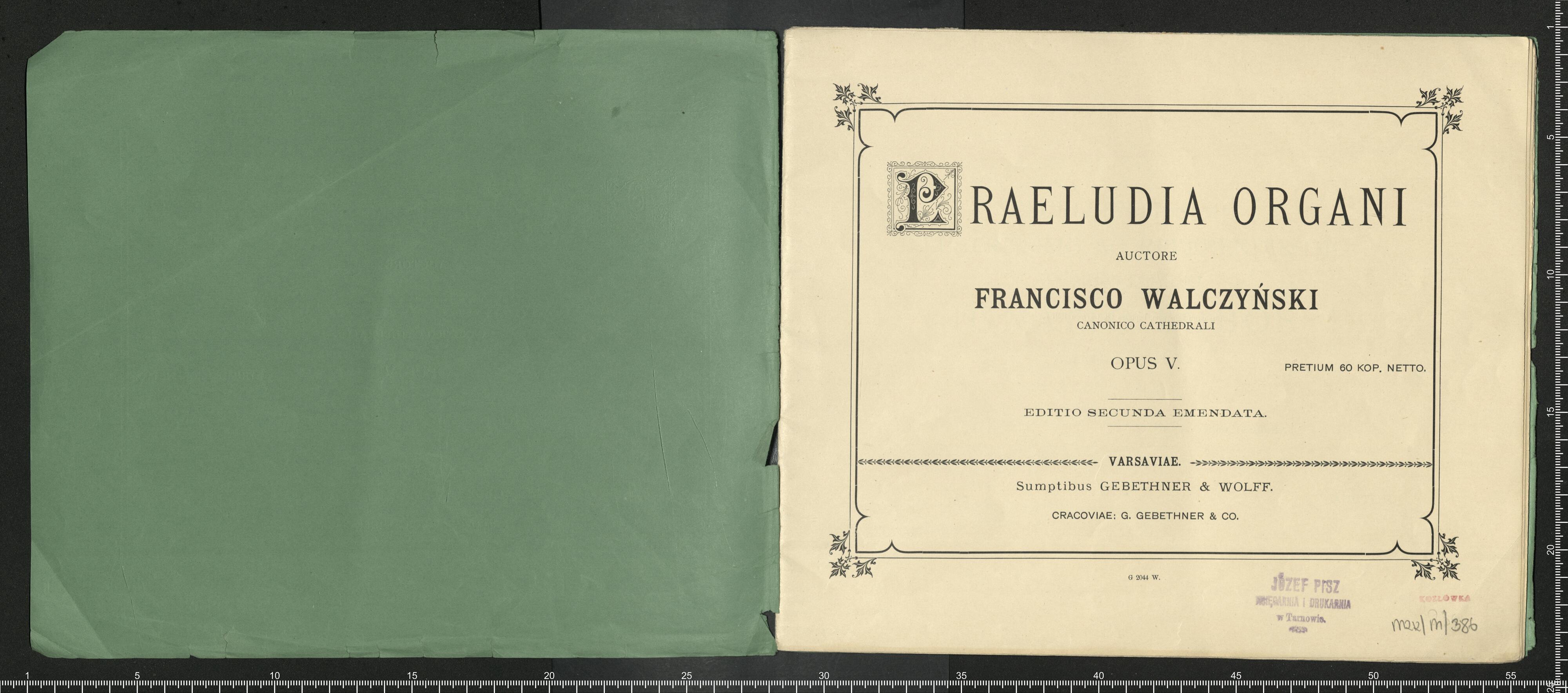 PRAELUDIA ORGANI | AUCTORE | FRANCISCO WALCZYŃSKI | CANONICO CATHEDRALI | OPUS V. RETIUM 60 KOP. NETTO | EDITIO SECUNDA EMENDATA. | VARSAVIAE. | Sumptibus GEBETHNER & WOLFF. | CRACOVIAE: GEBETHNER & CO. | G 2044 W