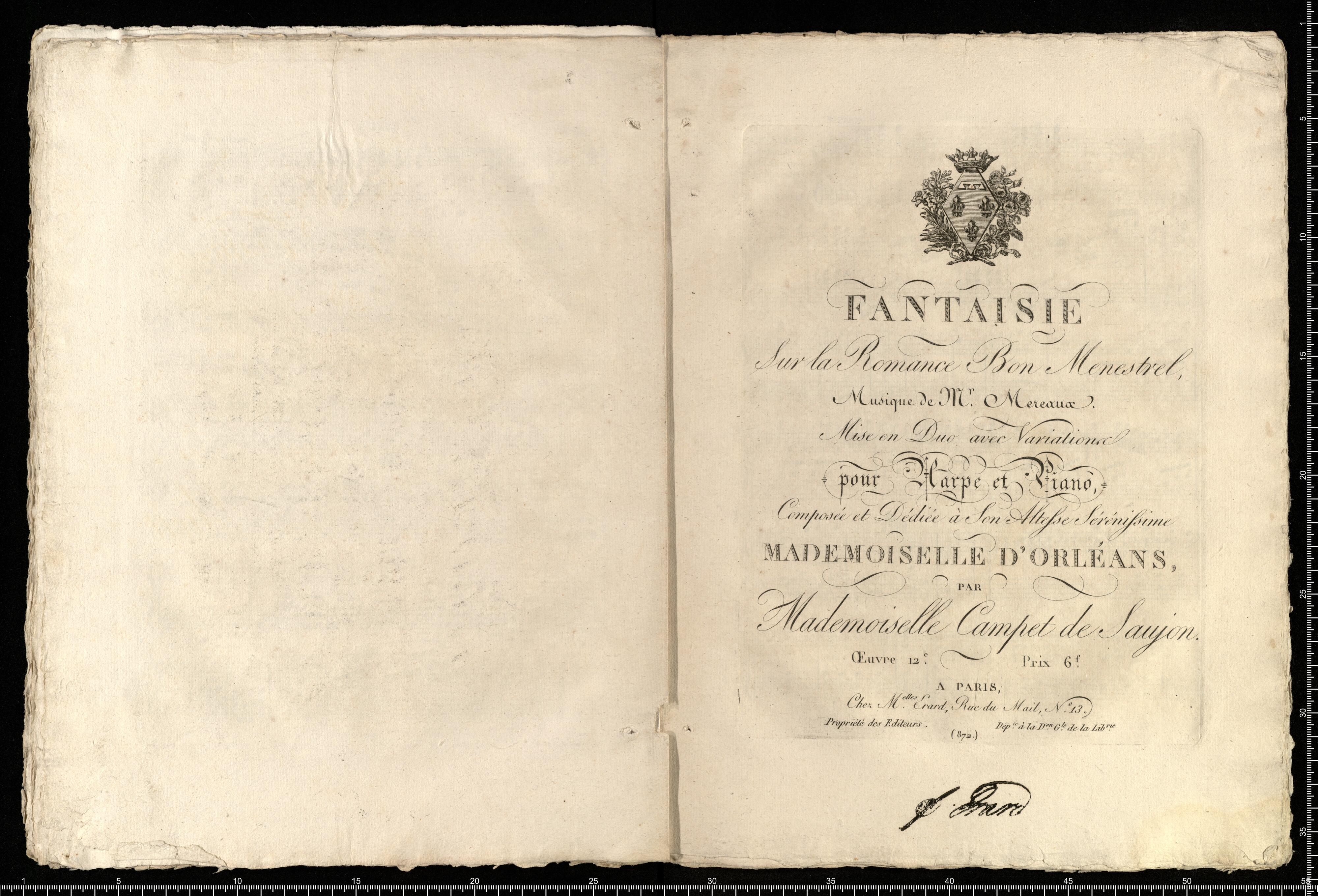 FANTASIE | Sur la Romance Bon Menstrel | Musique de M|r Mereaux. | Mise en Duo avec Variations | pour Harpe et Piano, | Composé et dédiée à Son Altesse Sérénissime | MADEMOISELLE D'ORLÉANS, | PAR | Mademoiselle Campet de Saujon. | Oeuvre 12|e Prix 6|f | A PARIS | Chez M|e|l|t|e|s Erard, Rue du Mail, N|o 13. | Propriété des Editeurs. Dép. à la D|o|n G|l|e de laLib|r|i|e | (872.)