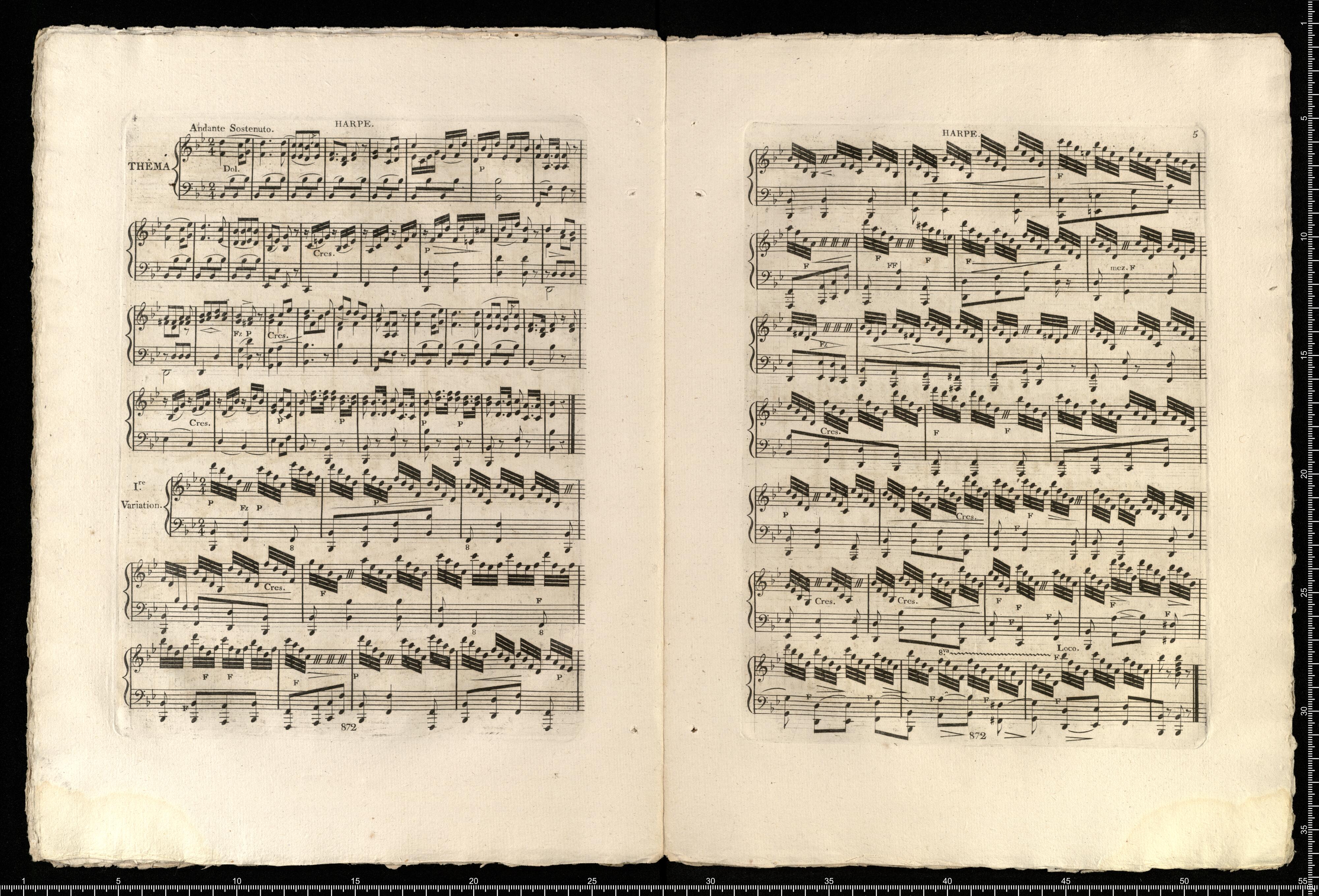 FANTASIE | Sur la Romance Bon Menstrel | Musique de M|r Mereaux. | Mise en Duo avec Variations | pour Harpe et Piano, | Composé et dédiée à Son Altesse Sérénissime | MADEMOISELLE D'ORLÉANS, | PAR | Mademoiselle Campet de Saujon. | Oeuvre 12|e Prix 6|f | A PARIS | Chez M|e|l|t|e|s Erard, Rue du Mail, N|o 13. | Propriété des Editeurs. Dép. à la D|o|n G|l|e de laLib|r|i|e | (872.)