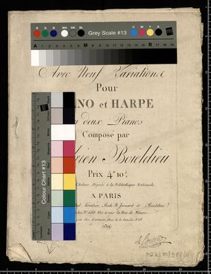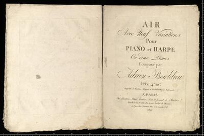 AIR | Avec Neuf Variations | Pour | PIANO et HARPE | Ou deux Pianos | Composé par | Adrien Boieldieu | Prix 4|H 10|s | Propriéé de l'Auteur. Déposé a la Bibliothéque Nationale. | A PARIS | Chez Chérnbini, Méhul, Kreutzer, Rode. N. Isouard et Boieldieu. | Rue de la Loi, N|o 268. Vis-a-vis la Rue de Ménars.| A Lyon chez Garnier, Place de la Comédie, N|o 13. | (139), Air avec neuf variations pf, arp