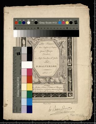 Pot-Pourri | d'Airs Anglais & Ecossais | pour Harpe | Dédié | à Miss Caroline S|t Jules | Par | P. DALVIMARE | Prix 5|H | A PARIS | Chez Berton & Loraux I|e Editeurs de Musique | & M|d|s d'Instruments, rue Feydau, attenant le Théâtre. | à Lion chez Garnier, place de la Comédie N|o 18. | Caraffe _Del Choireau Scrip. Ruotte Scul, Potpourri d'airs anglais & ecossais arp Arr