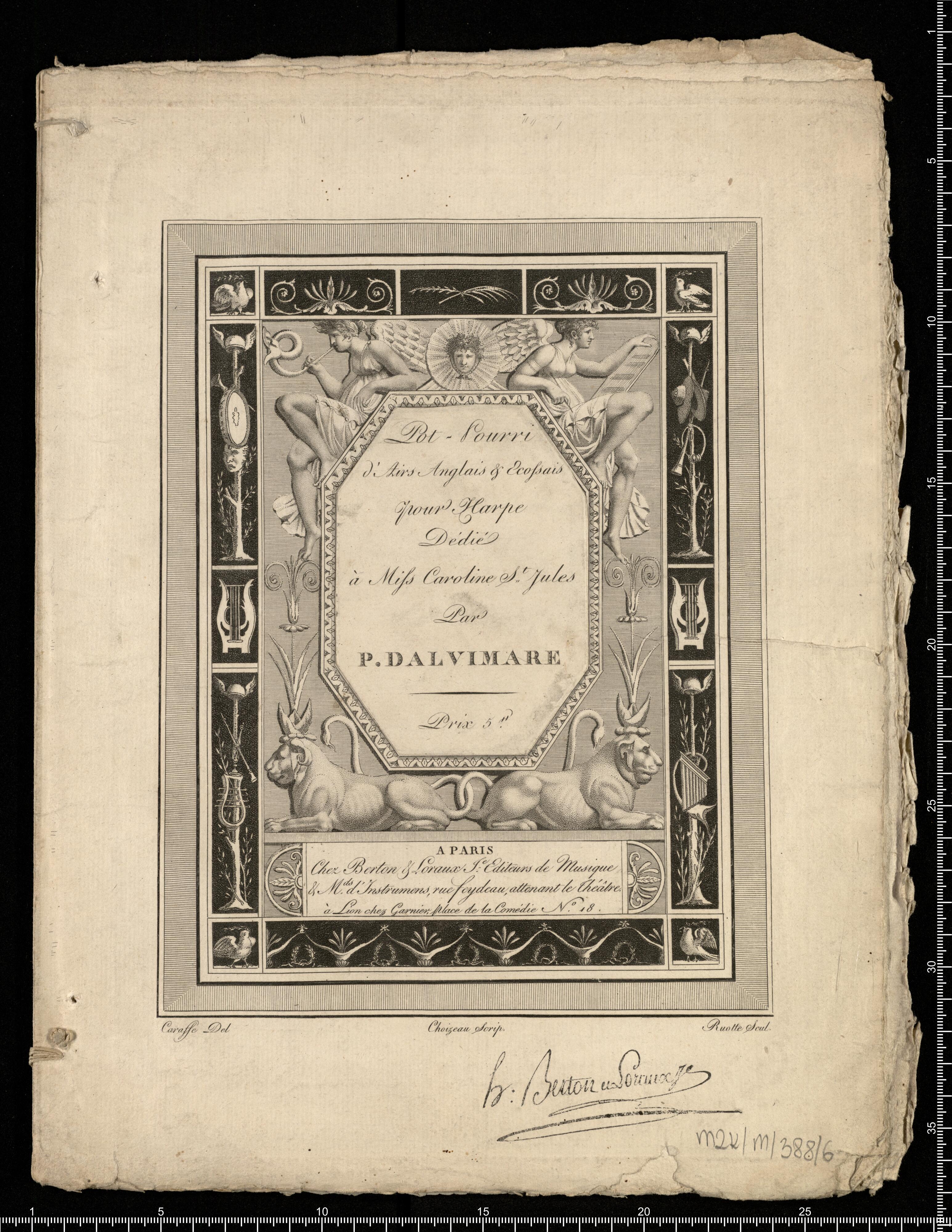 Pot-Pourri | d'Airs Anglais & Ecossais | pour Harpe | Dédié | à Miss Caroline S|t Jules | Par | P. DALVIMARE | Prix 5|H | A PARIS | Chez Berton & Loraux I|e Editeurs de Musique | & M|d|s d'Instruments, rue Feydau, attenant le Théâtre. | à Lion chez Garnier, place de la Comédie N|o 18. | Caraffe _Del Choireau Scrip. Ruotte Scul