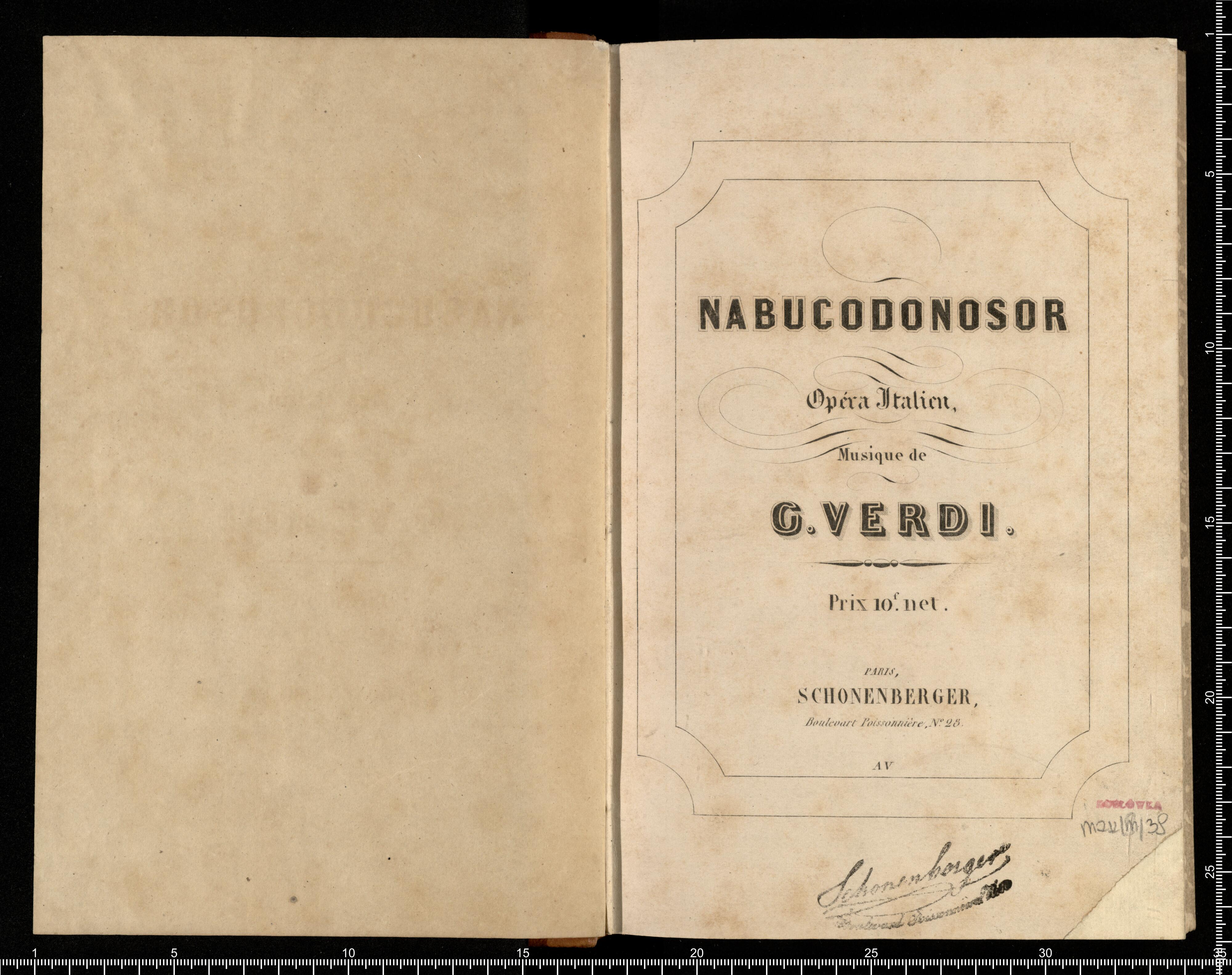 NABUCODONOSOR | Opéra Italien, | Musique de | G. VERDI. | Prix 10|f net. | PARIS, | SCHONENBERGER, | Boulevard Poissonnière, N|o 23. | AV