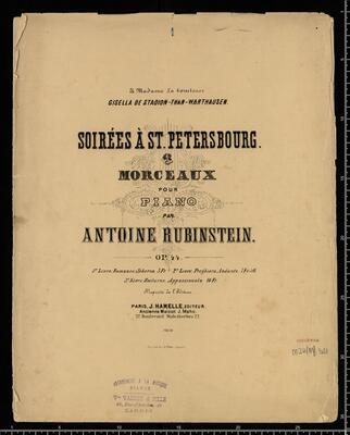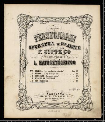 [pl-text: Napis na karcie przedtytułowej czerwoną kredką: Instytut Muzyczny], [pl-text: Napis na karcie przedtytułowej ołówkiem:własność Krajewskiego], [pl-text: Napis na karcie tytułowej w prawym górnym rogu, trochę ucięty: [ucięte]au 25.8.83.], [pl-text: Podpis na karcie tytułowej, nieco poniżej tytułu czarnym atramentem: Celina Hipe.], [pl-text: Pieczęć na karcie tytułowej w prawym dolnym rogu: Księgarnia | Skład i wypożyczalnia nut | A. CYBULSKI | POZNAŃ | Czytelnie polska, franc ang. i niem.]