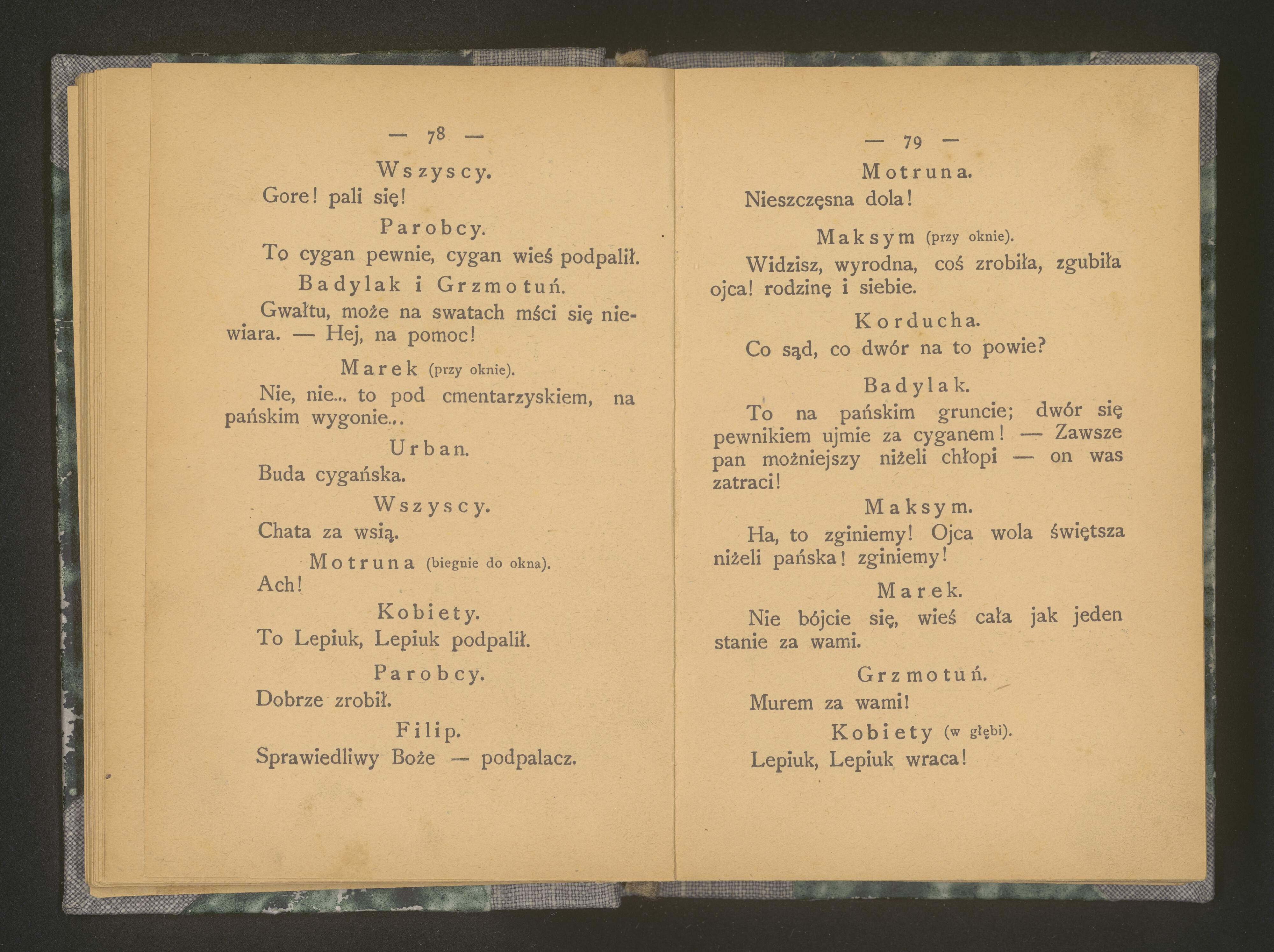 [title page:] 103 NARÓD SOBIE! 103 | J. K. Galasiewicz | i Z. Mellerowa | CHATA ZA WSIĄ | Dramat ludowy w 5 aktach | ze śpiewami i tańcami. | Muzyka | Zygmunta Noskowskiego. | — | (Rzecz wzięta z powieści | J. I. Kraszewskiego). | Nakładem Księgarni A. Cybulskiego w Poznaniu. | Czcionka Drukarni Dziennika Poznańskiego. 1912