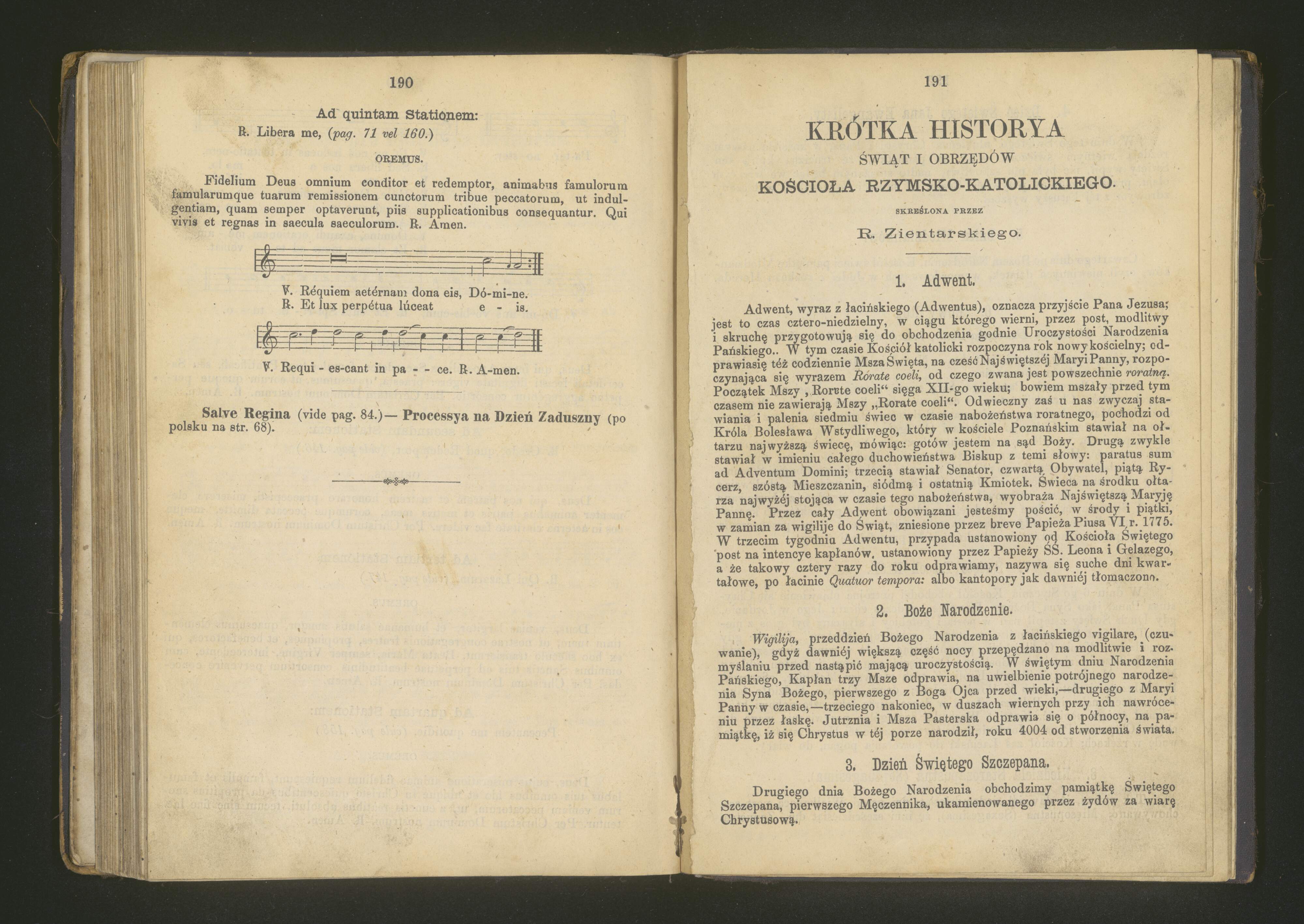 ŚPIEWNIK KOŚCIELNY | (Cantionale ecclesiasticum) | OBRJMUJĄCY | Pieśni, Hymny, Antyfony, Nieszpory etc. | Z MELODYAMI | ORAZ | Objaśnienia tyczace się Swiąt [!] i Obrzędów | KOŚCIOŁA | RZYMSKO-KATOLICKIEGO | UŁOŻONY PODŁUG | Muzyki kościelnéj, choralnéj i figuralnéj | Romualda Zientarskiego. | WARSZAWA. | w Drukarni Jana Jaworskiego, | ULICA KRAKOWSKIE-PRZEDMIEŚCIE NR. 415. | 1870