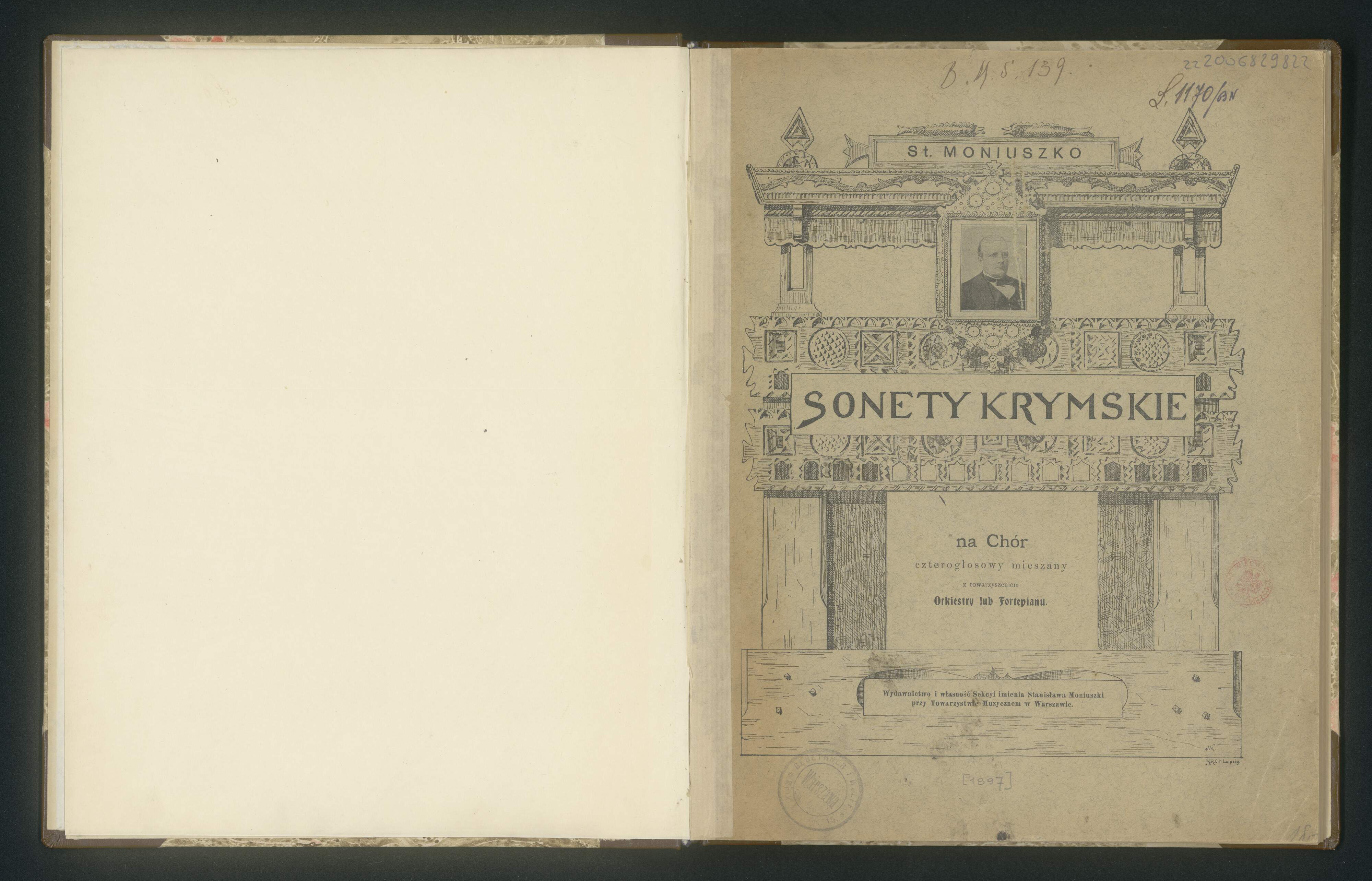 [cover title:] S. MONIUSZKO | SONETY KRYMSKIE | na Chór | czterogłosowy mieszany | z towarzyszeniem | Orkiestry lub Fortepianu | Warszawskie Towarzystwo Muzyczne. | Wydawnictwo i własność Sekcyi Imienia Moniuszki. | M. R. C|o Leipzig