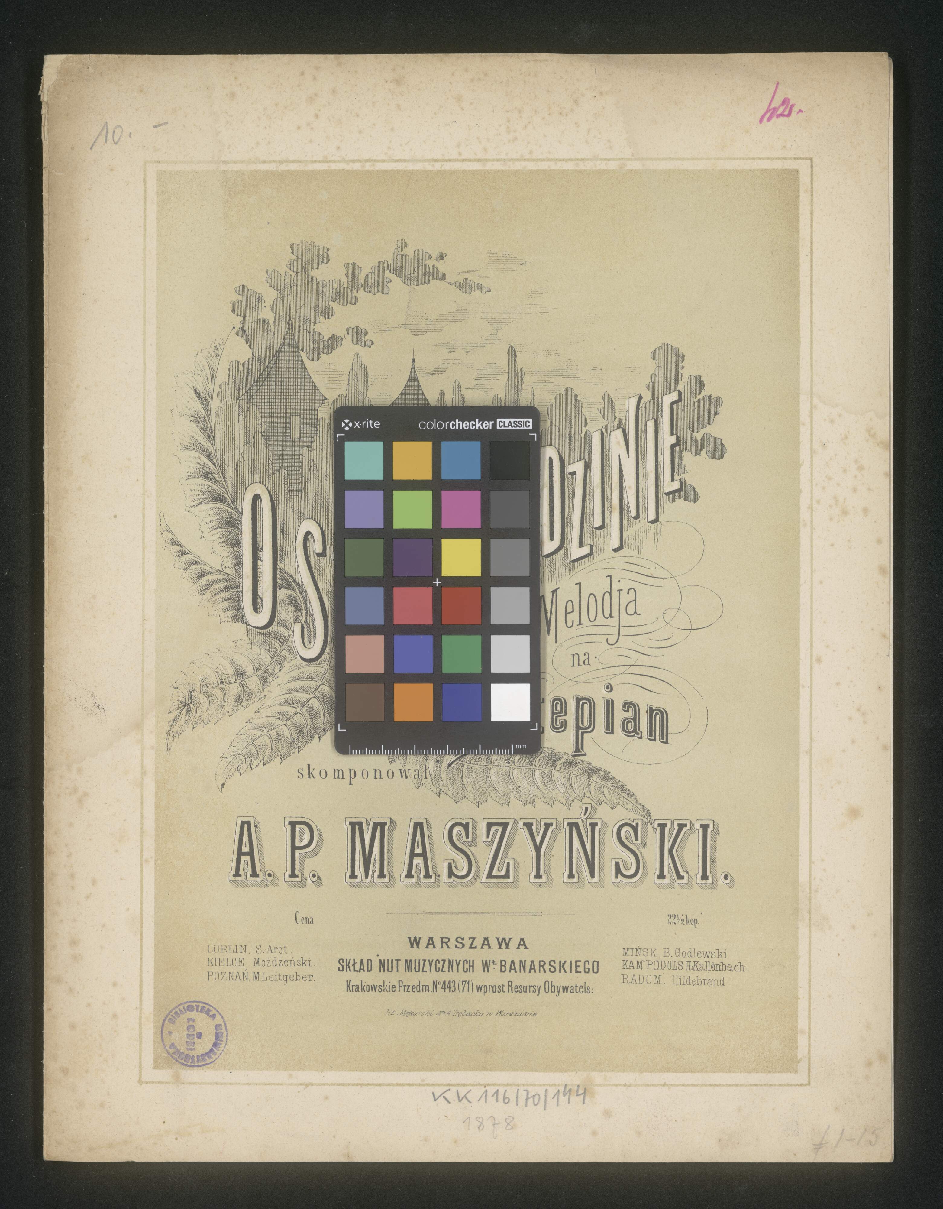 [title page:] O SZAREJ GODZINIE | Melodja | na | Fortepian | skomponował | A.P. MASZYŃSKI | Cena | 22|1/2|kop. | LUBLIN. S. Arct. | KIELCE | Możdżeński. | POZNAŃ. M. Leitgeber. | WARSZAWA | SKŁAD NUT MUZYCZNYCH W|Ł|. BANARSKIEGO | Krakowskie Przedm. N|o|. 443(71) wprost Resursy Obywatels: | MIŃSK, B. Godlewski | KAMPODOLS H. Kallenbach | RADOM. Hildebrand | lit, Mękarski N|o 6 Trębacka w Warszawie