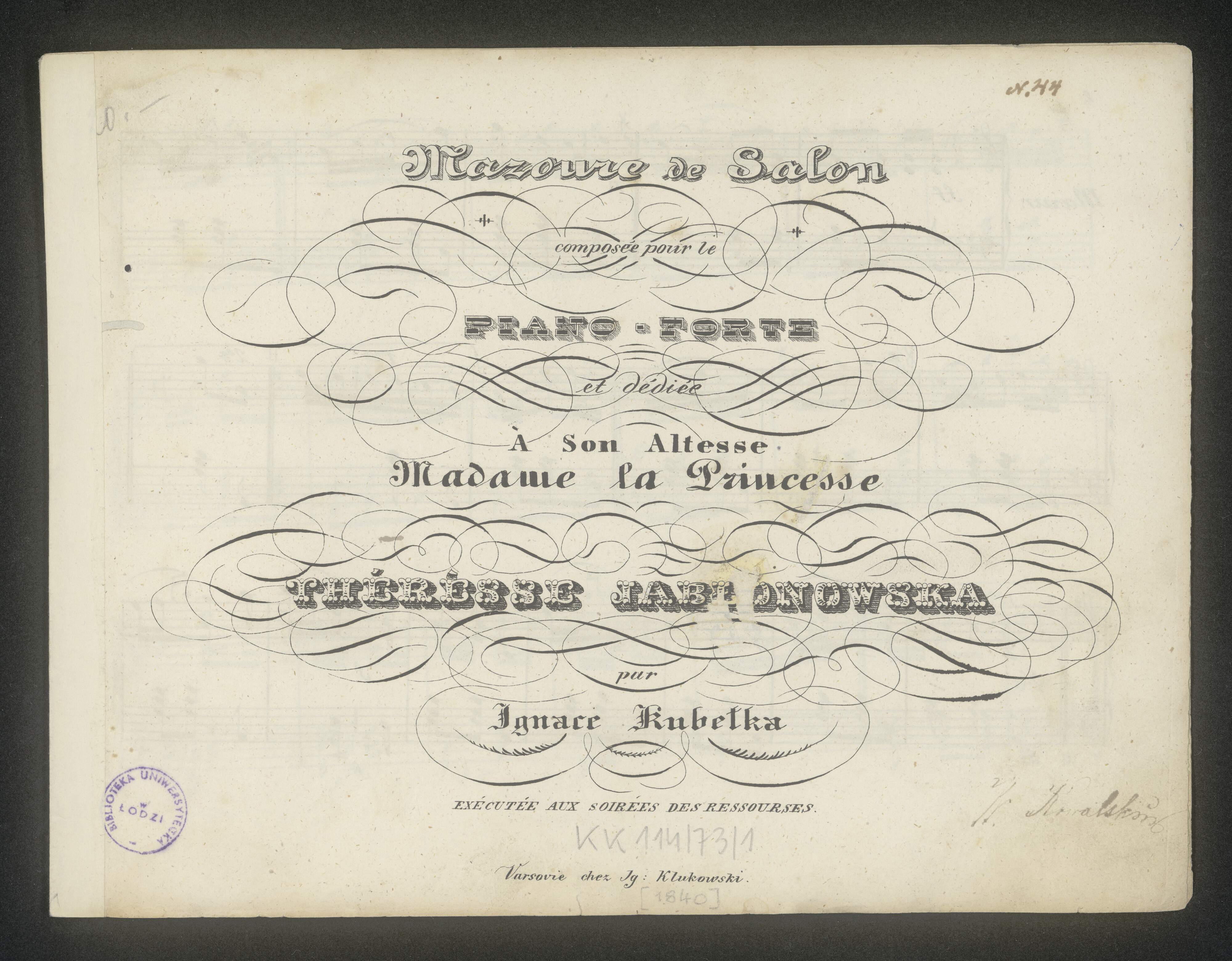 [title page:] Mazoure de Salon | composée pour le | PIANO-FORTE | et dédiée | À Son Altesse | Madame la Princesse | THÉRÉSSE JABŁONOWSKA | par | Ignace Kubełka | EXÉCUTIÉE AUX SOIRÉES DES RESSOURSES. | Varsovie chez IG: Klukowski