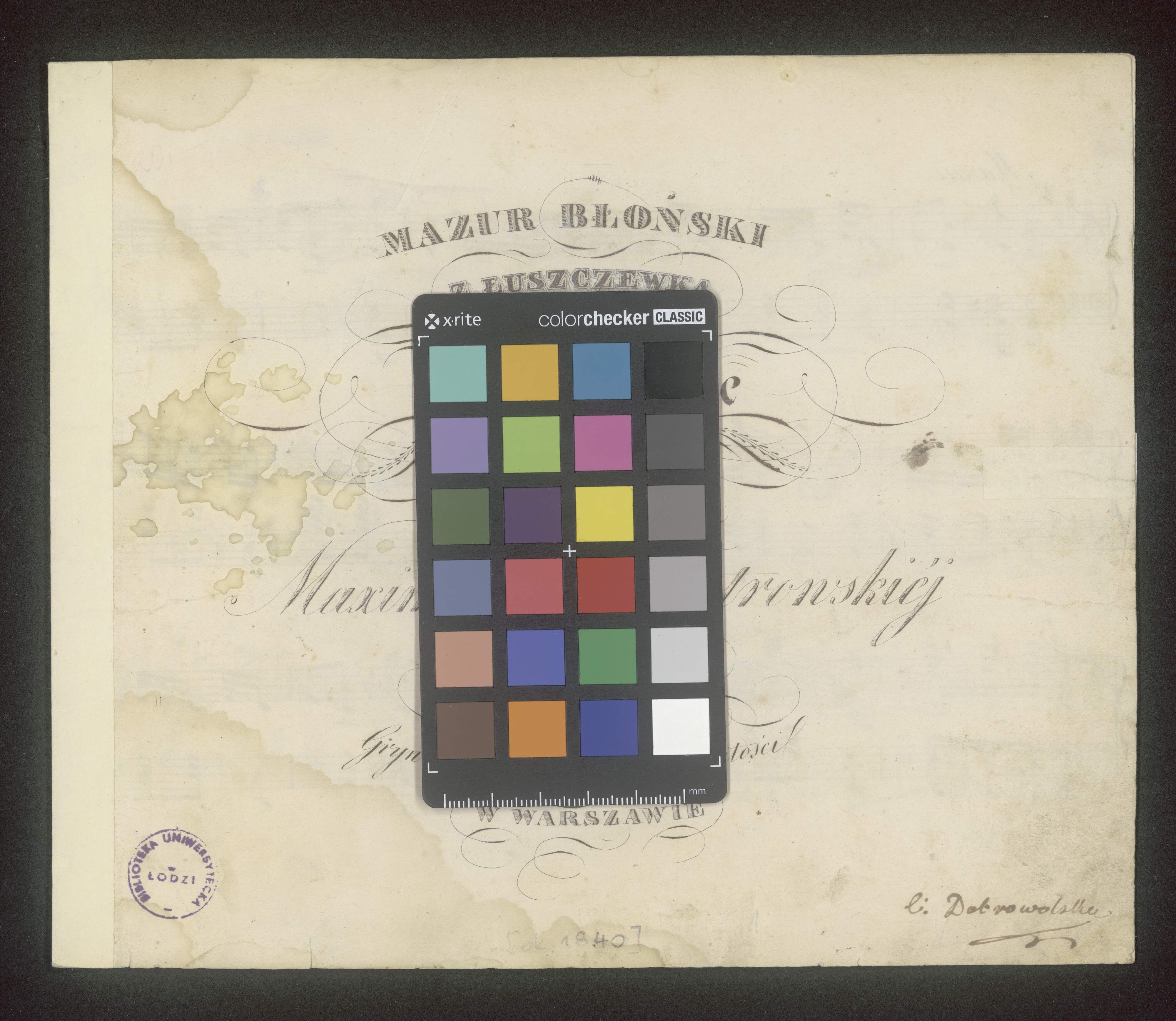 [title page:] MAZUR BLOŃSKI | Z ŁUSZCZEWKA | skomponowany na | Piano Forte | ofiarowany | W|é|j Pannie | Maximiliannie Ostrowskiéj | przez | J. Z. | Grywany w Teatrze Rozmaitości | W WARSZAWIE