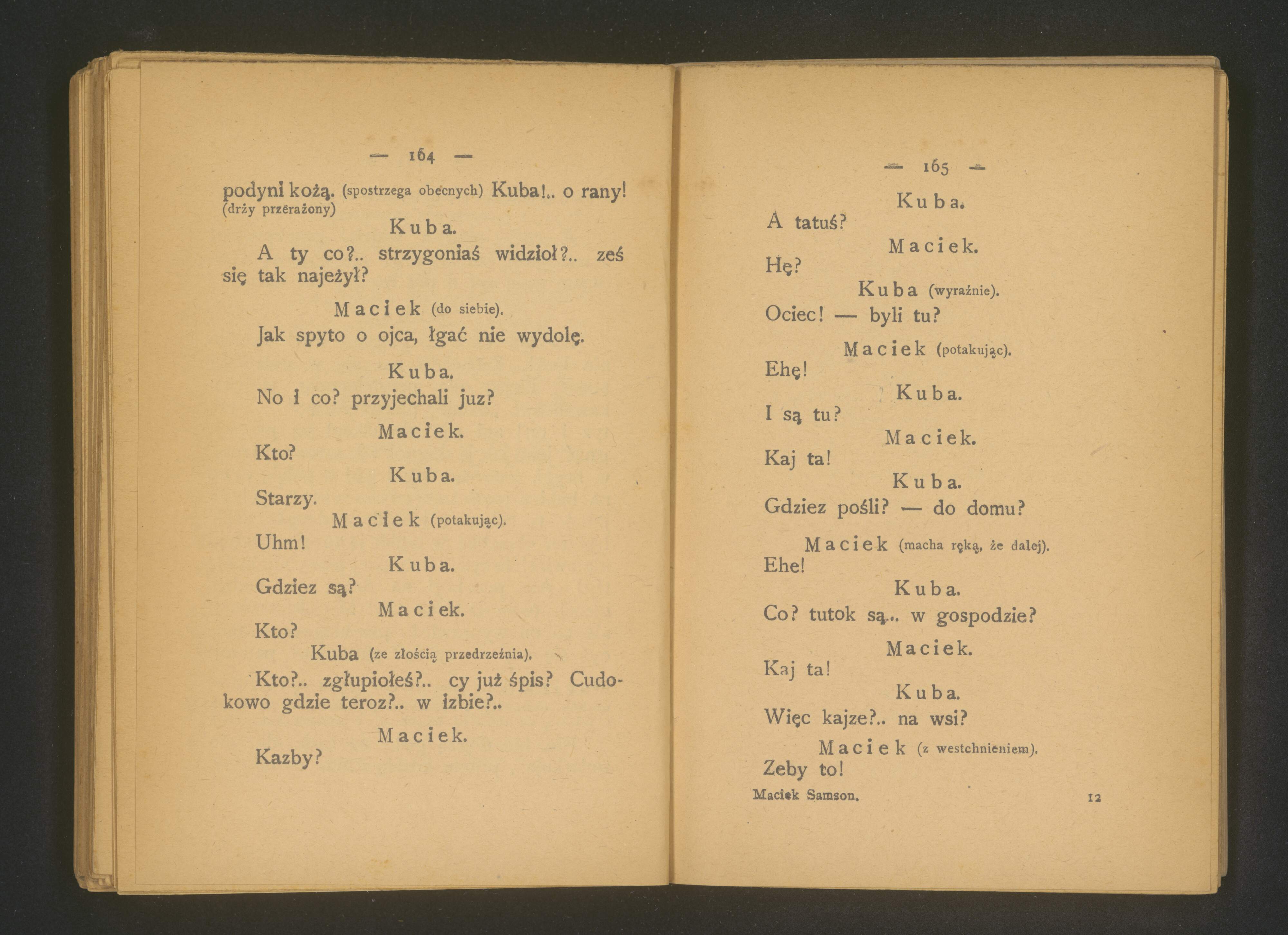 [title page:] 105 NARÓD SOBIE! 105 | Maciek Samson | Krotochwila ludowa | w 3 aktach | ze śpiewami i tańcami | przez J. K. Galasiewicza | z muzyką | Adama Wrońskiego. | Nakładem Księgarni A. Cybulskiego | w Poznaniu. | Czcionkami Drukarni Dziennika Poznańskiego. | 1913