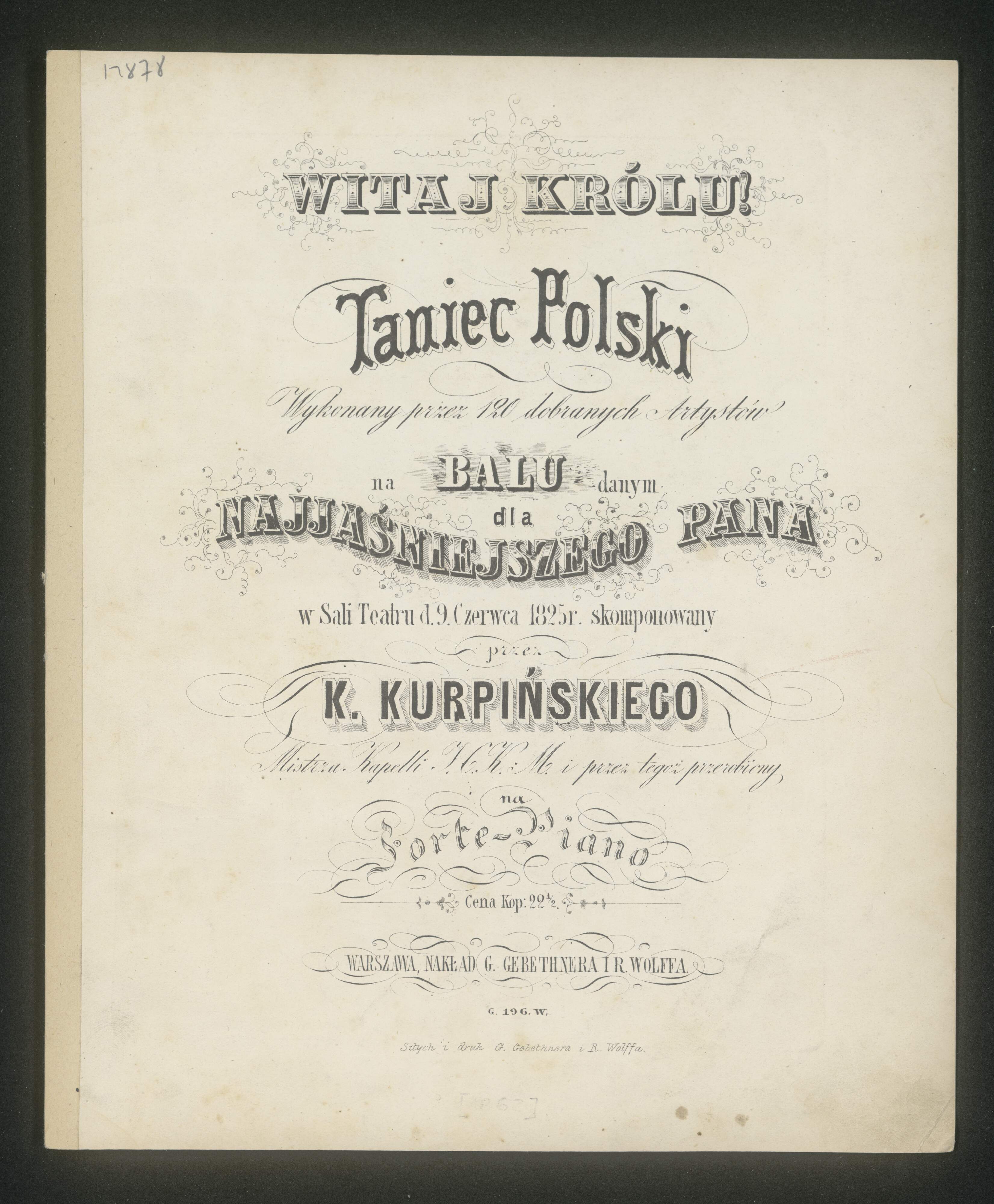 [title page:] WITAJ KRÓLU! | Taniec Polski | Wykonany przez 120 dobranych Artystów | na BALU danym | dla | NAJJAŚNIEJSZEGO PANA | w Sali Teatru d. 9. Czerwca 1825 r. skomponowany | przez | K. KURPIŃSKIEGO | Mistrza Kapeli J.C.K.M. i przez tegoż przerobiony, | na | Forte-Piano | Cena Kop: 22 1/2. | WARSZAWA, NAKŁAD G. GEBETHNERA i R. WOLFFA, | G. 196. W. | Sztych i druk G. Gebethnera i R. Wolffa