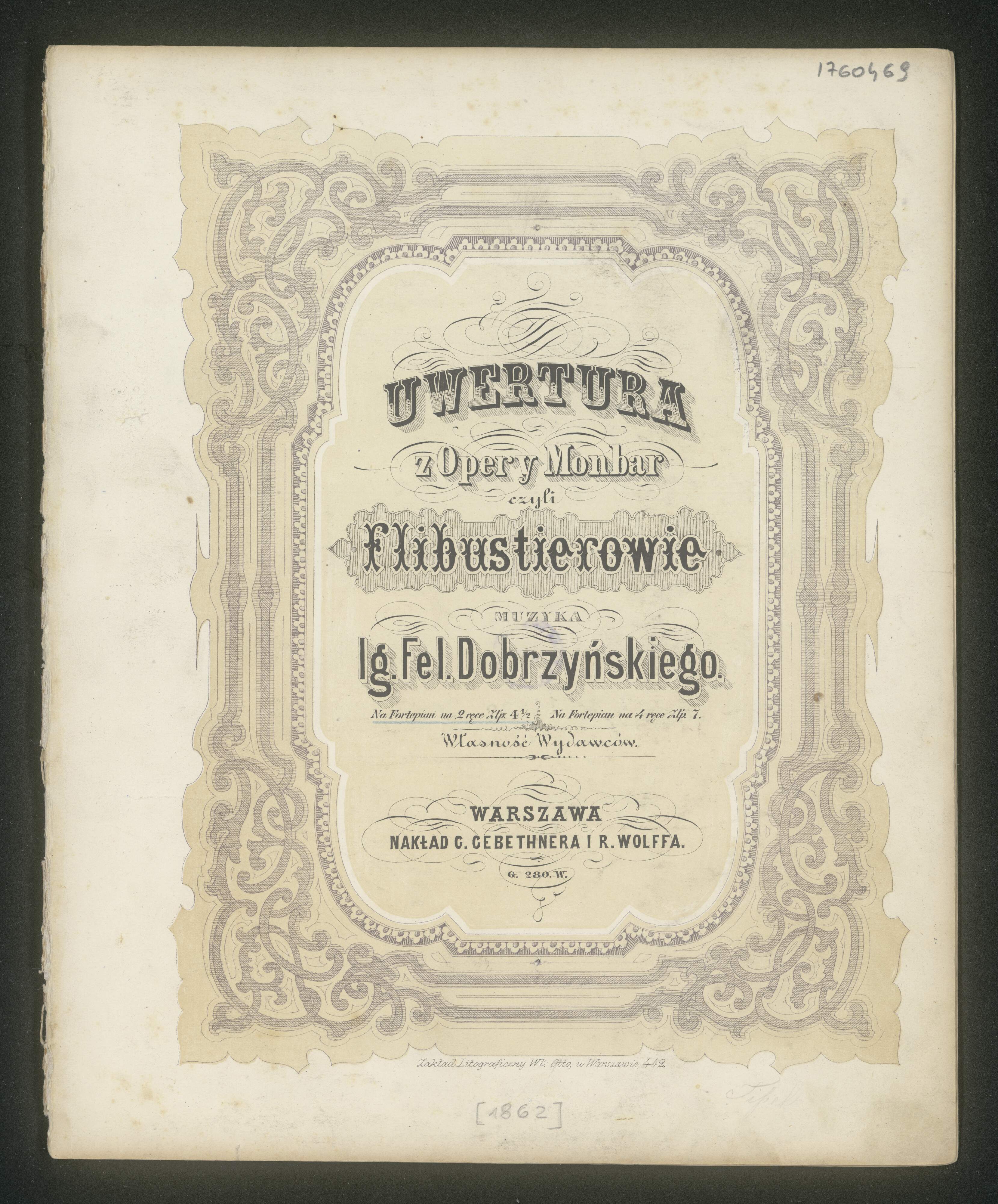 [title page:] UWERTURA | z Opery Monbar | czyli | Flibustierowie | MUZYKA | Ig. Fel. Dobrzyńskiego. | Na Fortepian na 2 ręce Złp. 4 1/2 | Na Fortepian na 4 ręce Złp. 7 | Własność Wydawców. | Zakład Litograficzny Wł. Otto w Warszawie 442