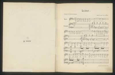 [pl-text: Druk oprawiony w obwolutę z napisem: "Wypożyczalnia otwarta od godz. 9 do 1 i od 3 do 7 wieczór. | Z Magazynu Nut i Wypożyczalni Nowości Muzycznych | Bernarda Połonieckiego we Lwowie ul. Kl. Tańskiej L. 1. | Delibes | Lakmé. | Śpiew".], [pl-text: Stemple: "SKŁAD NUT | KSIĘGARNI POLSKIEJ | we LWOWIE." i "Z Wypożyczalni Nowości Muzycznych | Barnarda Połonieckiego we Lwowie.".], [pl-text: na odwrocie karty tytułowej okrągła pieczątka „BUŁ”. Poniżej sygnatura „M 16536”.], On the insert of the title page circle stamp "BUŁ". Signature below "M 16536"., [pl-text: wewnątrz notatki wprowadzone ołówkiem], Inside handwritten notes with pencil