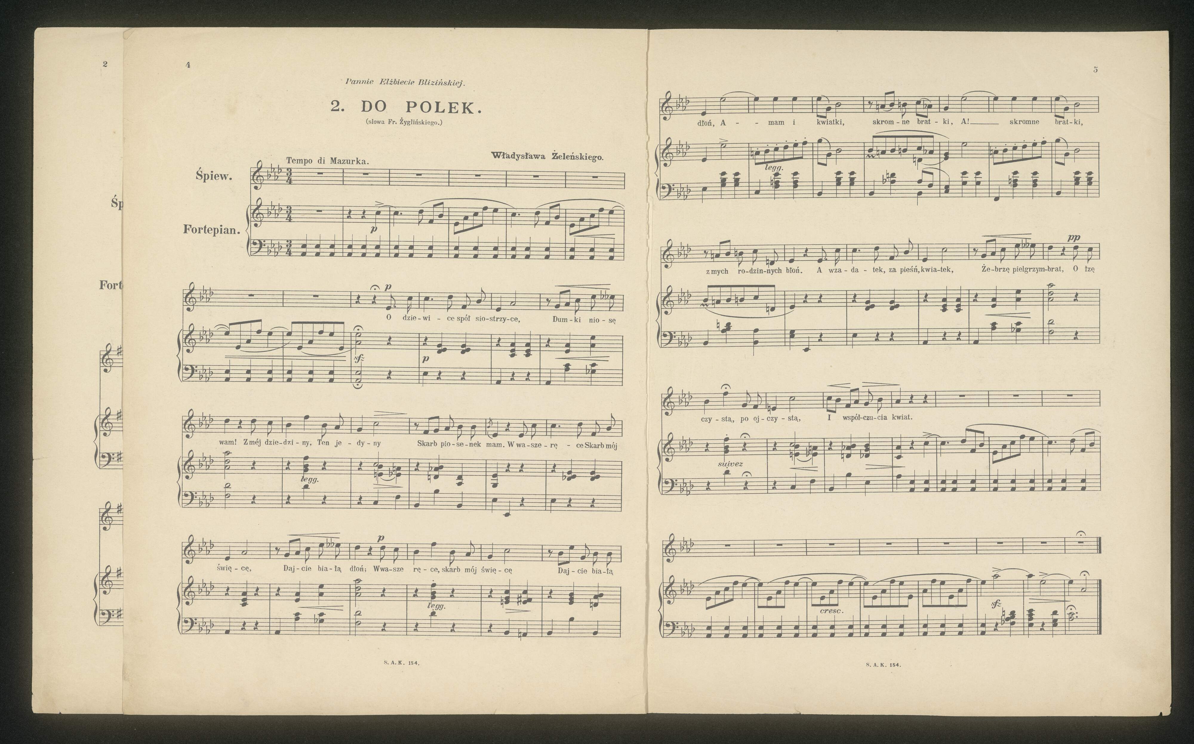 [title page:] DWIE PIEŚNI | I. Czarna sukienka. | Słowa K. Gaszyńskiego. | II. Do Polek. | Słowa Fr. Żyglińskiego. | z towarzyszeniem | FORTEPIANU | przez | Władysława Żeleńskiego | dz. 12. | Wydanie drugie. | KRAKÓW | Nakład i własność księgarni i składu nut | S. A. KRZYŻANOWSKIEGO. | Musikaliendruckerei v. Jo. Eberle&C|o Wien, VII. Bez | 355/93
