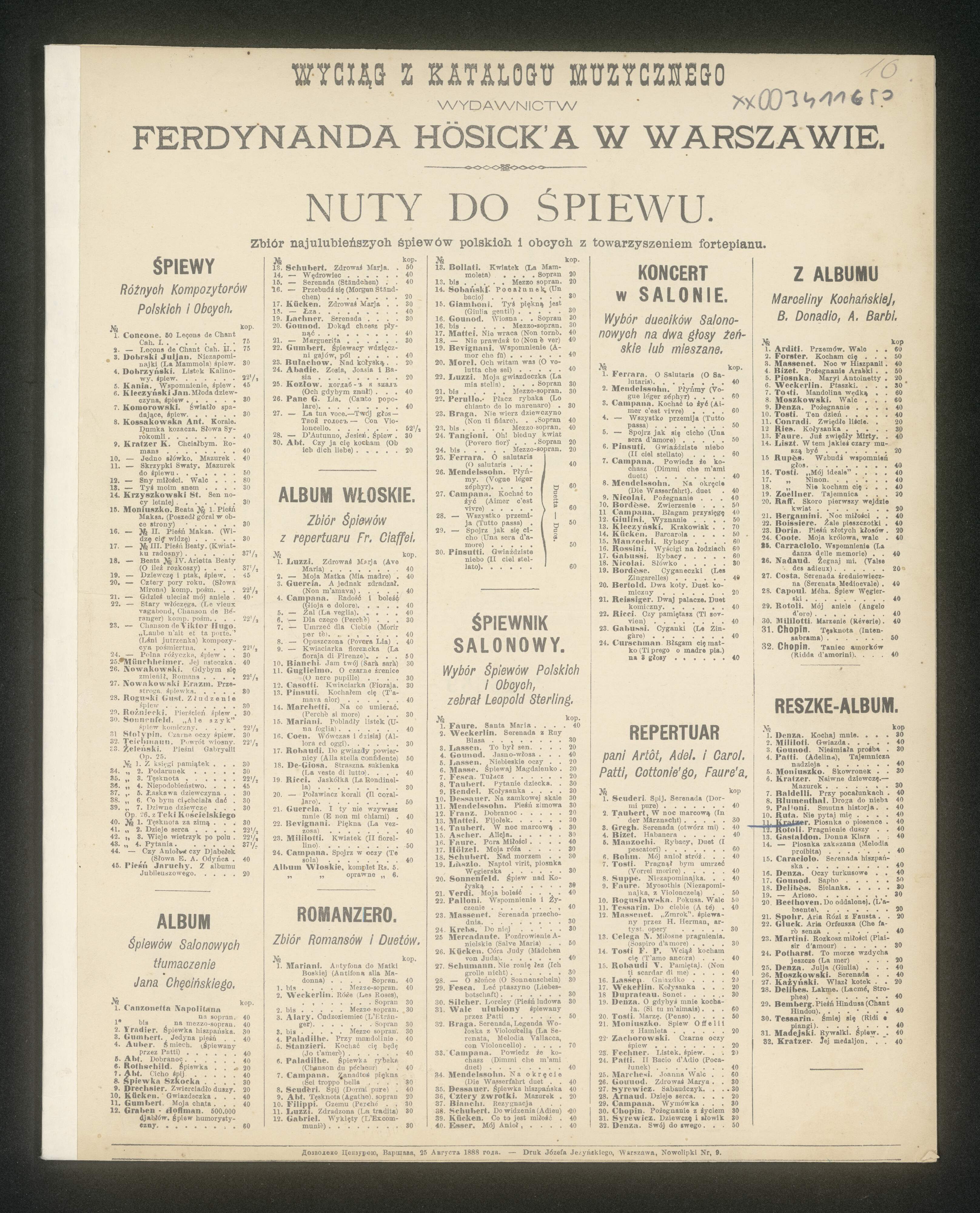 WYCIĄG Z KATALOGU MUZYCZNEGO | WYDAWNICTW | FERDYNANDA HÖSICK'A W WARSZAWIE | NUTY DO ŚPIEWU. | Zbiór najulubieńszych śpiewów polskich i obcych z tawarzyszeniem fortepianu. | [list of compositions in 5 columns] | Дозволено Цензурою. Вашава. 25 Августа 1888 года. - Druk Józefa Jeżyńskiego, Warszawa, Nowolipki Nr, 9