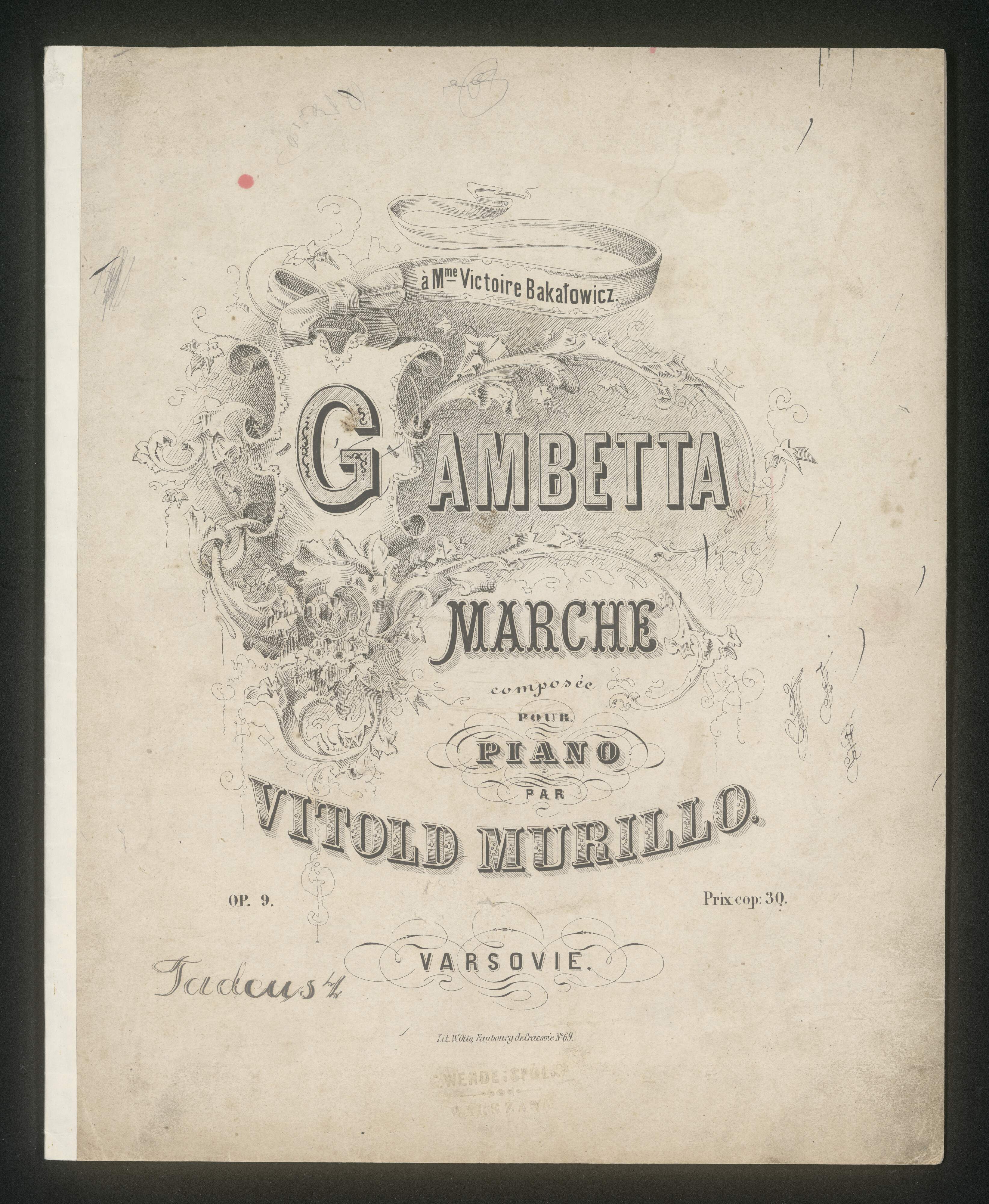 [title page:] à M|m|e Victoire Bakałowicz | GAMBETTA | MARCHE | composée | POUR | PIANO | PAR | VITOLD MURILLO. | OP. 9. | Prix cop: 30 | VARSOVIE. | Lit. W. Otto, Faubourg de Cracovie N|o 69
