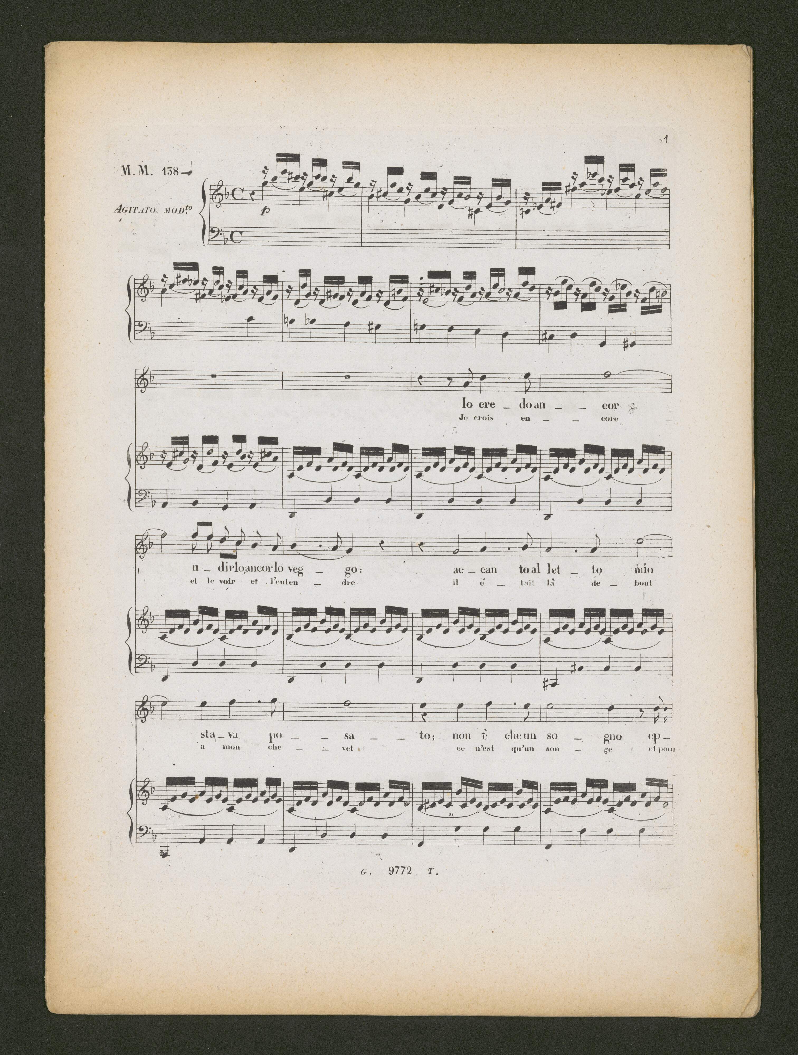 [title page:] Il Sogno di Tartini | BALLATA | Canto (in Chiave di Violino) | con accomp|o. di piano-forte | e Violino obbligato | DI | C. DE BERIOT | N. 9772 | [price] | Milano presso Gio. Ricordi | Deposta all' I. R. Bibl|a. | Milano presso Gio. Ricordi. | NAPOLI [space] ROMA [space] FIRENZE