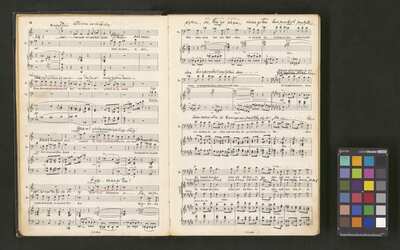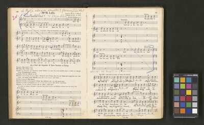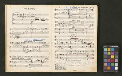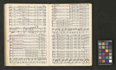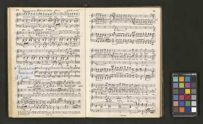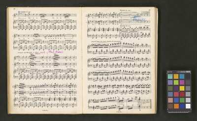 [pl-text: Fioletowa owalna pieczęć: Otok: "GEBETHNER I WOLFF | KRAKÓW, Rynek 26.." pole: "SKŁAD NUT" na stronie tytułowej.], Purple oval stamp: "GEBETHNER I WOLFF | KRAKÓW, Rynek 26. | SKŁAD NUT" on TP., [pl-text: Niebieska okrągła pieczęć: otok: „* TEATR WIELKI-OPERA NARODOWA *”, pole: „MUZEUM | TEATRALNE” na s. 298.], Blue round stamp: "* TEATR WIELKI-OPERA NARODOWA * MUZEUM | TEATRALNE" on p. 298., [pl-text: Prostokątna nalepka: „MUZEUM TEATRALNE W | WARSZAWIE” na tylnej stronie oprawy.], Rectangular sticker: " MUZEUM TEATRALNE W | WARSZAWIE" on back., [pl-text: Na s. 297 notatka ołówkiem - skład chóru, lista nazwisk.], On p. 297 note: choir cast, name list., [pl-text: Niebieska okrągła pieczęć: otok: „* TEATR WIELKI-OPERA NARODOWA *”, pole: „MUZEUM | TEATRALNE” na s. 298.], Blue round stamp: "* TEATR WIELKI-OPERA NARODOWA * MUZEUM | TEATRALNE" on p. 298., [pl-text: Niebieska okrągła pieczęć: Otok: "*BRATNIA POMOC* | Słuchaczy Państw. Wyższej Szkoły Operowej", pole: "w Poznaniu" na s. 299.], Blue round stamp: "*BRATNIA POMOC* | Słuchaczy Państw. Wyższej Szkoły Operowej * w Poznaniu" on p. 299., 2006 18/2006 51041218