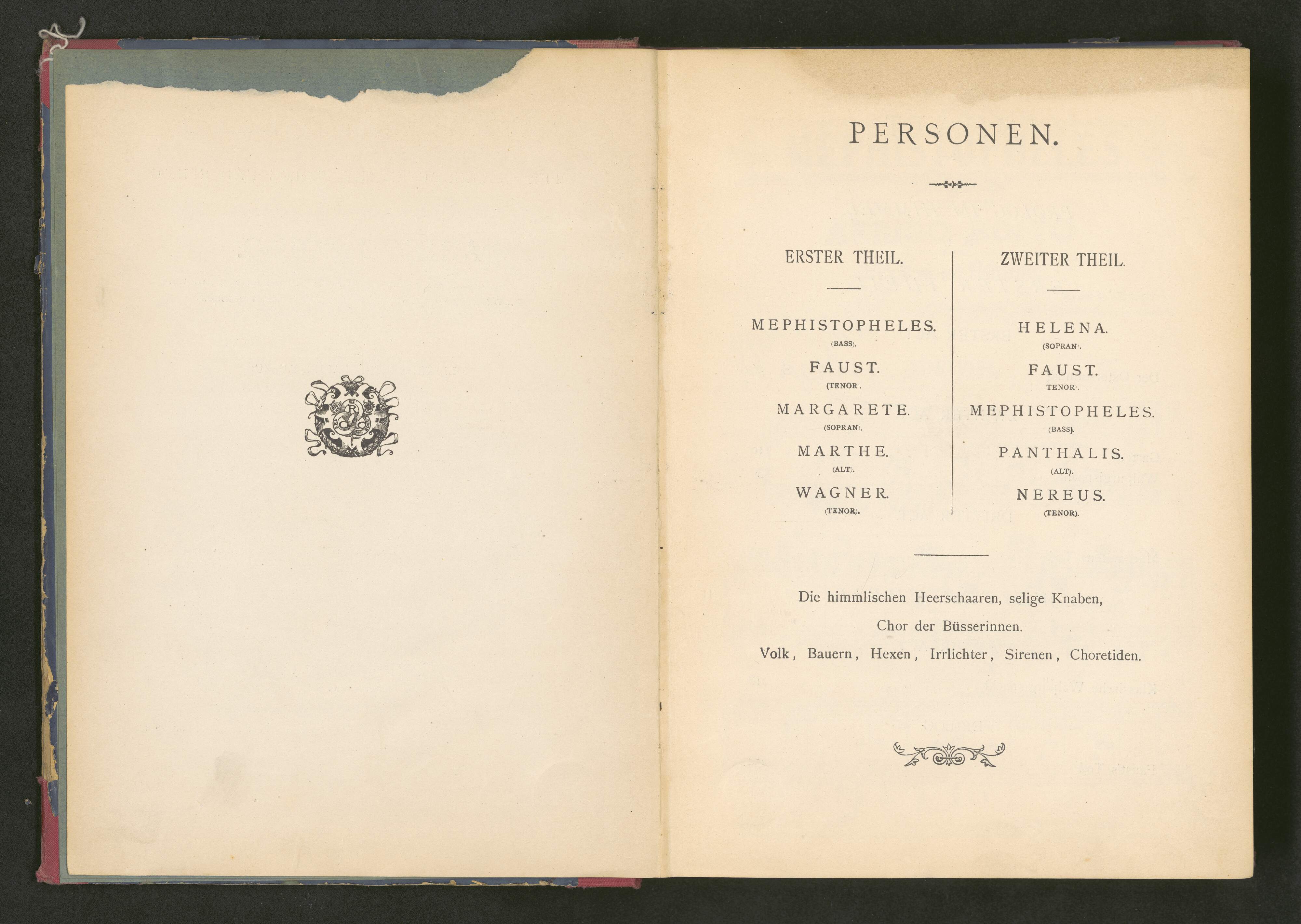 [title page:] MEPHISTOPHELES | OPER IN VIER ACTEN MIT PROLOG UND EPILOG | VON | ARRIGO BOITO. | Zu der für Deutschland bestimmten Bearbeitung sind die mit << >> bezeichneten Goethe'schen Verse | vom Verfasser selbst verwendet worden. Das Uebrige ist übersetzt von C. NIESE. | VOLLSTÆNDIGER CLAVIER-AUSZUG | MIT DEUTSCHEM TEXT. | Preis: (A) nett Fr. 16 - Mk. 12 - | Eigentragen germäss den internationalen Vertägen. - Eigenthum für alle Länder. | Alle Rechte der Auflührung, Reproduction, Ausführung, Uebersetzung und Bearbeitung sind vorbehalten | G. RICORDI & C. | MUSIK-VERLAG | 4/6, Querstrasse - L E I P Z I G - Querstrasse, 4/6 | MAILAND, ROM - NEAPEL - PALERMO - PARIS - LONDON - BUENOS-AIRES - NEW-YORK | (PRINTED IN ITALY)