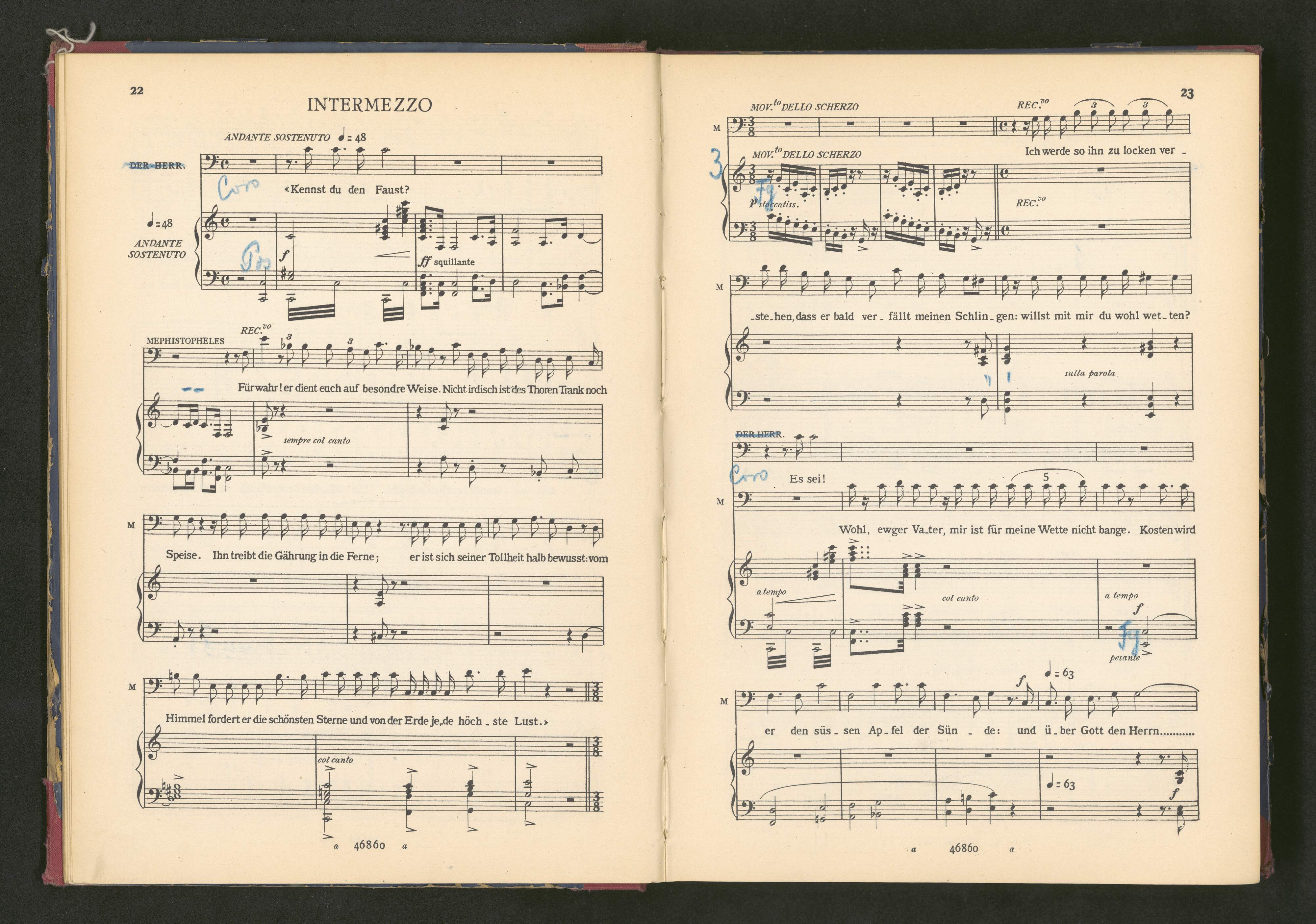 [title page:] MEPHISTOPHELES | OPER IN VIER ACTEN MIT PROLOG UND EPILOG | VON | ARRIGO BOITO. | Zu der für Deutschland bestimmten Bearbeitung sind die mit << >> bezeichneten Goethe'schen Verse | vom Verfasser selbst verwendet worden. Das Uebrige ist übersetzt von C. NIESE. | VOLLSTÆNDIGER CLAVIER-AUSZUG | MIT DEUTSCHEM TEXT. | Preis: (A) nett Fr. 16 - Mk. 12 - | Eigentragen germäss den internationalen Vertägen. - Eigenthum für alle Länder. | Alle Rechte der Auflührung, Reproduction, Ausführung, Uebersetzung und Bearbeitung sind vorbehalten | G. RICORDI & C. | MUSIK-VERLAG | 4/6, Querstrasse - L E I P Z I G - Querstrasse, 4/6 | MAILAND, ROM - NEAPEL - PALERMO - PARIS - LONDON - BUENOS-AIRES - NEW-YORK | (PRINTED IN ITALY)