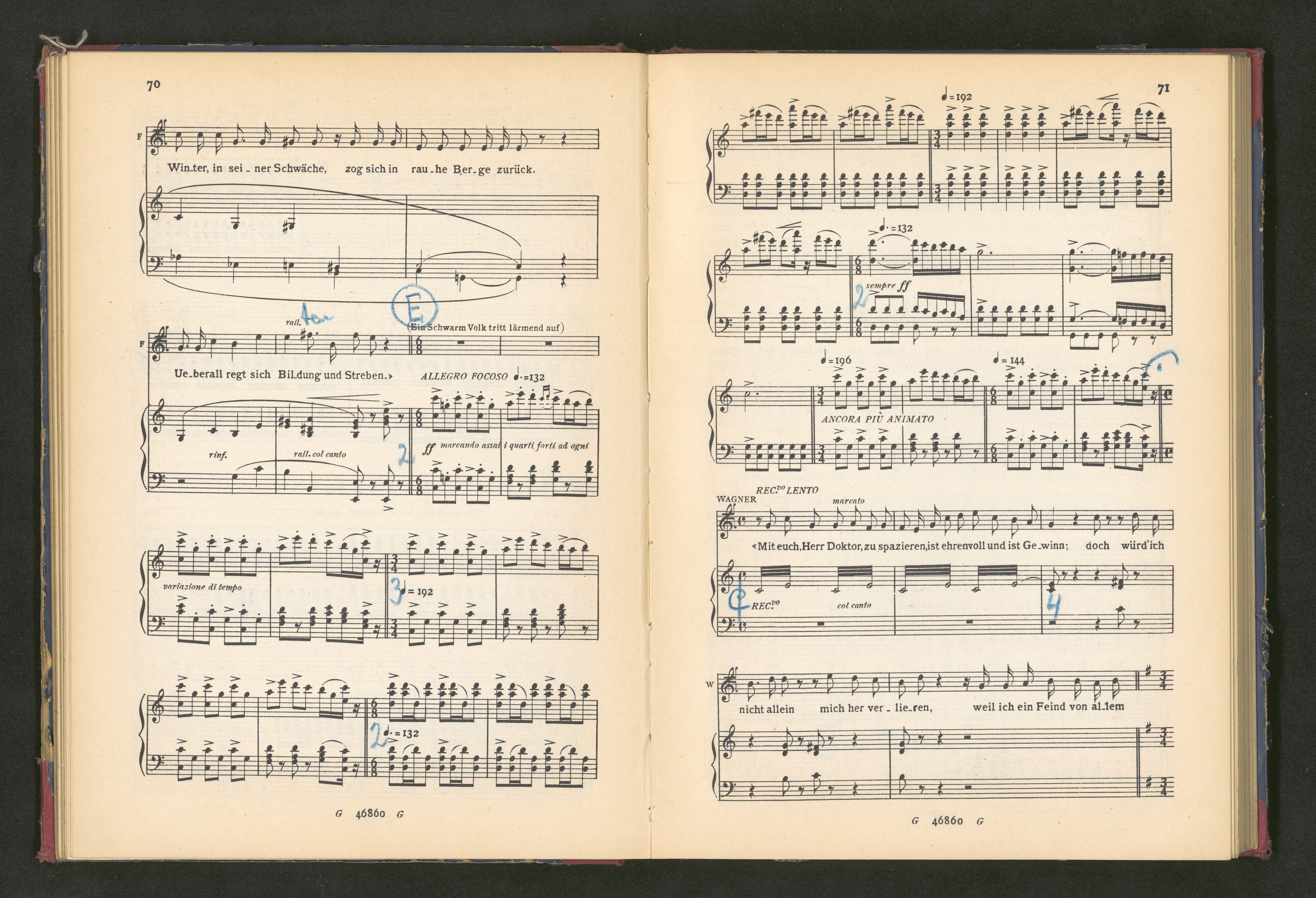 [title page:] MEPHISTOPHELES | OPER IN VIER ACTEN MIT PROLOG UND EPILOG | VON | ARRIGO BOITO. | Zu der für Deutschland bestimmten Bearbeitung sind die mit << >> bezeichneten Goethe'schen Verse | vom Verfasser selbst verwendet worden. Das Uebrige ist übersetzt von C. NIESE. | VOLLSTÆNDIGER CLAVIER-AUSZUG | MIT DEUTSCHEM TEXT. | Preis: (A) nett Fr. 16 - Mk. 12 - | Eigentragen germäss den internationalen Vertägen. - Eigenthum für alle Länder. | Alle Rechte der Auflührung, Reproduction, Ausführung, Uebersetzung und Bearbeitung sind vorbehalten | G. RICORDI & C. | MUSIK-VERLAG | 4/6, Querstrasse - L E I P Z I G - Querstrasse, 4/6 | MAILAND, ROM - NEAPEL - PALERMO - PARIS - LONDON - BUENOS-AIRES - NEW-YORK | (PRINTED IN ITALY)