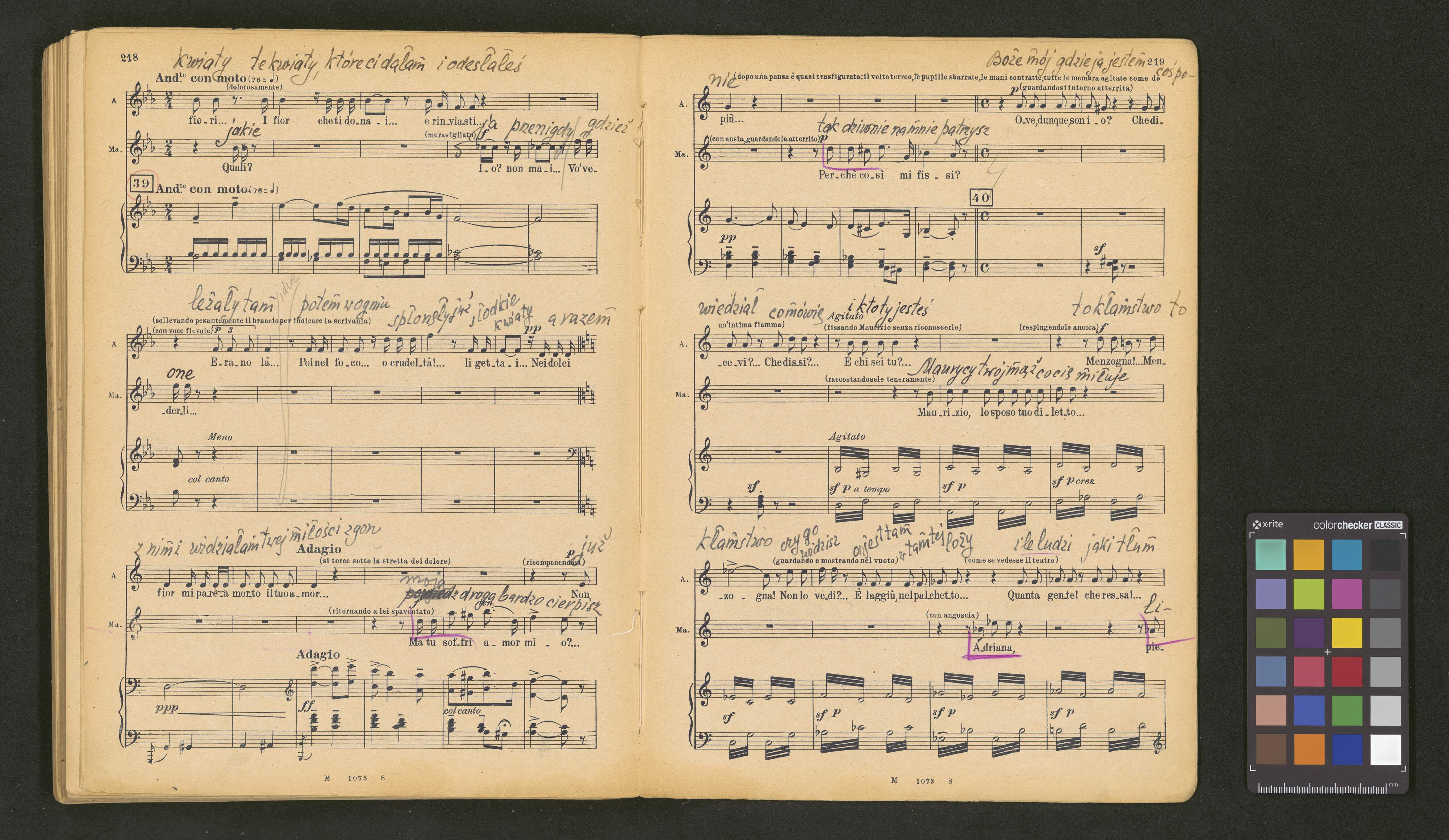 [title page:] Adriana Lecouvreur | commedia-dramma di E. SCRIBE ed E. LEGOUVÉ | ridotta in quattro atti per la scena lirica da A. COLAUTTI | Riduzione per CANTO e PIANOFORTE | (NUOVA EDIZIONE) | N. 1073 [space] Prezzo L. 40.- | (aumento compreso) | CASA MUSICALE SONZOGNO | Società Anonima - Capitale L. 1.500.000 | 12, VIA PASQUIROLO :: MILANO :: VIA PASQUIROLO, 12 | ROMA - NAPOLI - PALERMO | << Entered according to the Act of COngress in the year 1902 by Edoardo Sonzogno, Editore, in the office | of the Librarian of Congress at Washington >>
