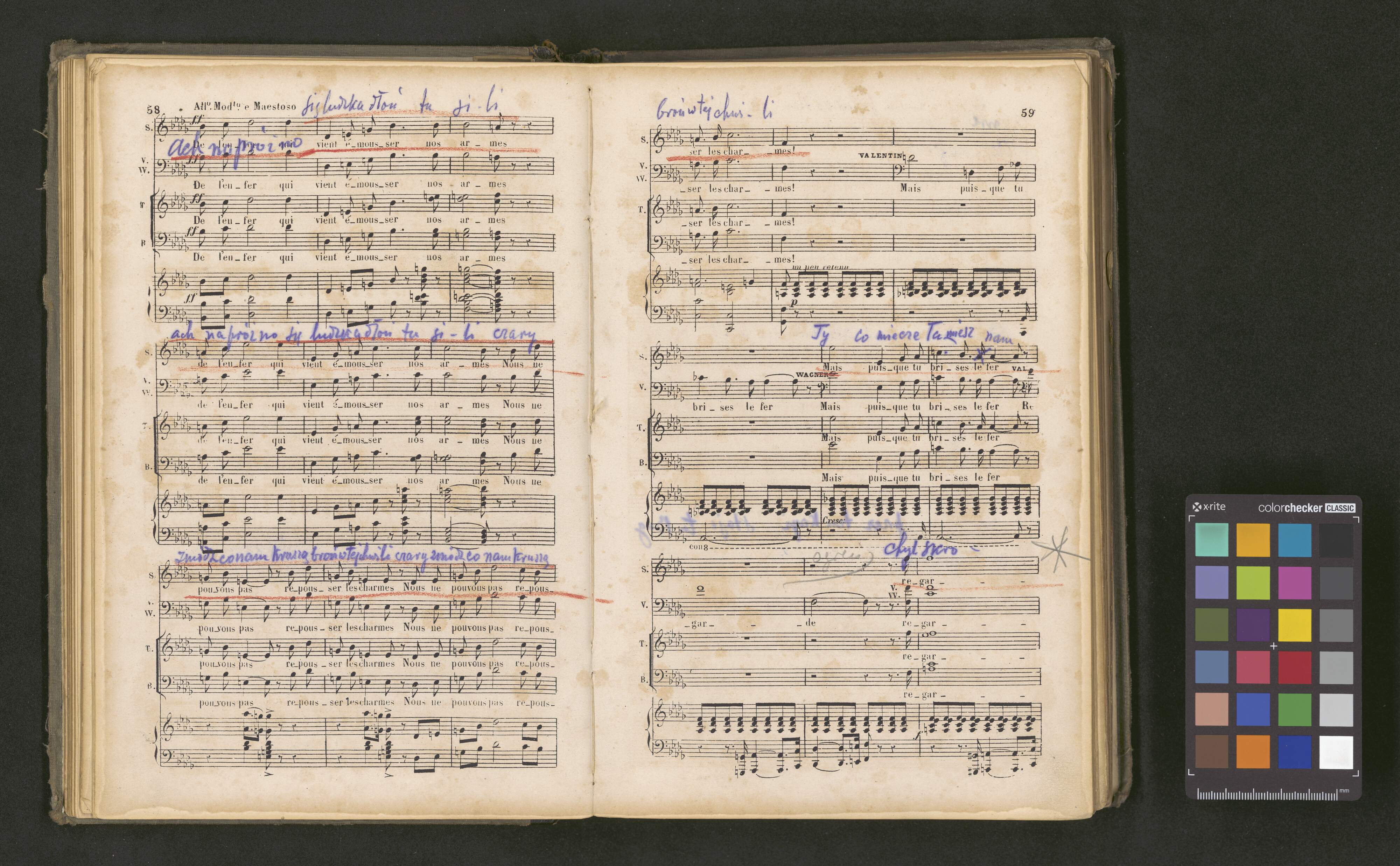 [left:] 2|e Edition | Avec les Recitatifs | Reduits Pour Piano [right:] 2|e Edition | Ajoutes par l'Auteur. | Par Emile PERIER. | FAUST | OPERA EN CINQ ACTES, | de MM|r|s | JULES BARBIER & MICHEL CARRE, | Musique de | CH. GOUNOD | PARTITION Piano & Chant, Arrangee par LEO DELIBES | P. DE CRAUZAT lith PRIX: 15|F net. | [left:] LIEGE | V|e L. Muraille, r. de l'Universite, 41. [right:] LONDRES | R. Mills, New-Bond Street, 140. | Paris, Choudens, Editeur, r. S|t Honore 265. pres l'Assomption | Allemagne: Botte et Bock S|t Petersbourg: Bernard. | Propriete p|r tous Pays. [on left, vertically:] Imp. Ch. TRINOCQ, F|s S|t Martin, 113, Paris