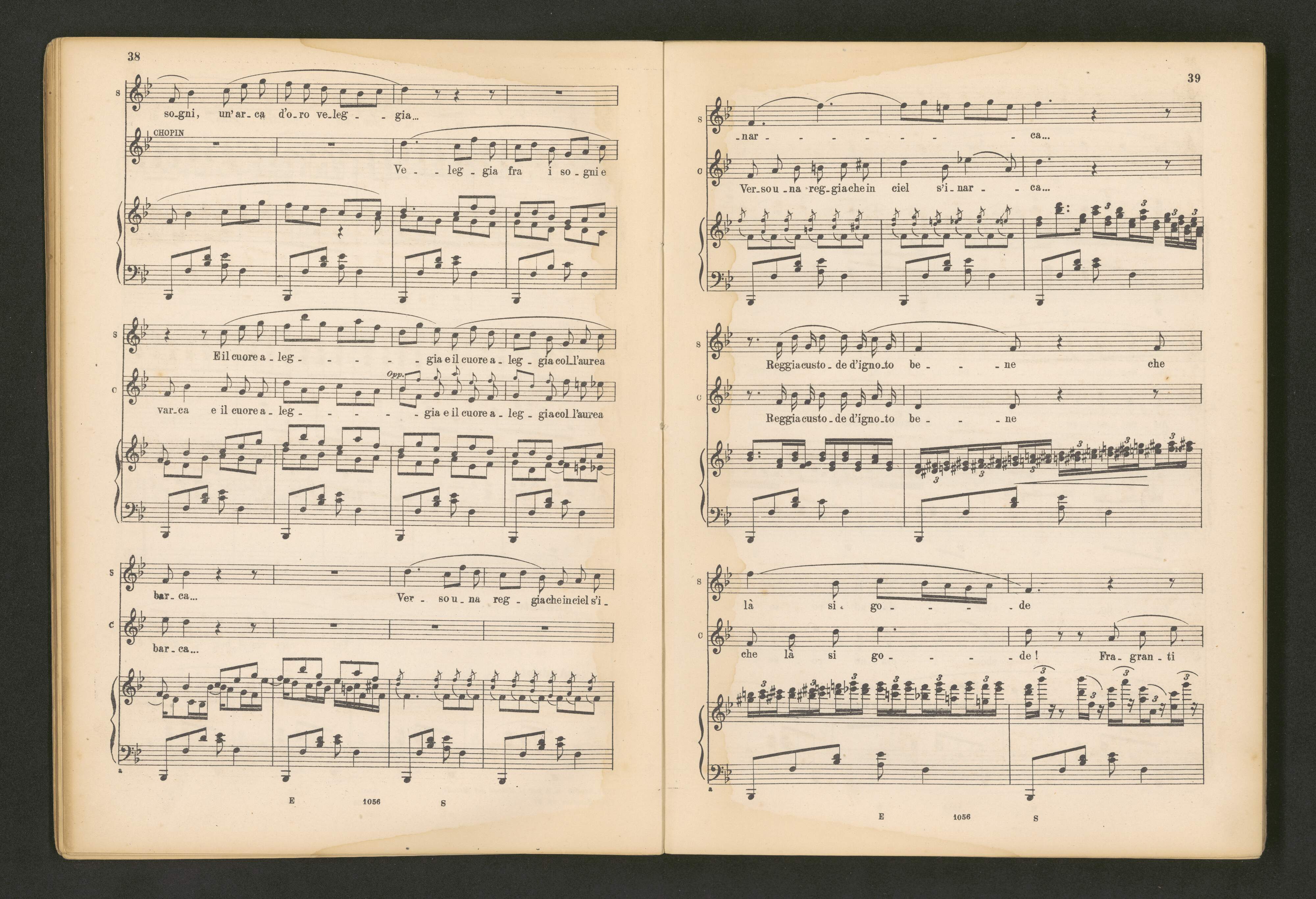 Chopin | Opera in 4 atti composta da | GIACOMO OREFICE | sulle melodie di F. Chopin. | Versi di ANGIOLO ORVIETO. | Canto e Pianoforte | MILANO | Edoardo Sonzogo, Editore | 14 - Via Pasquirolo - 14. | "Entered according to the Act of Congress, in the year 1901 by EDOARDO SONZOGNO, Editore | in the office of the Librarian of Congress at Washington."