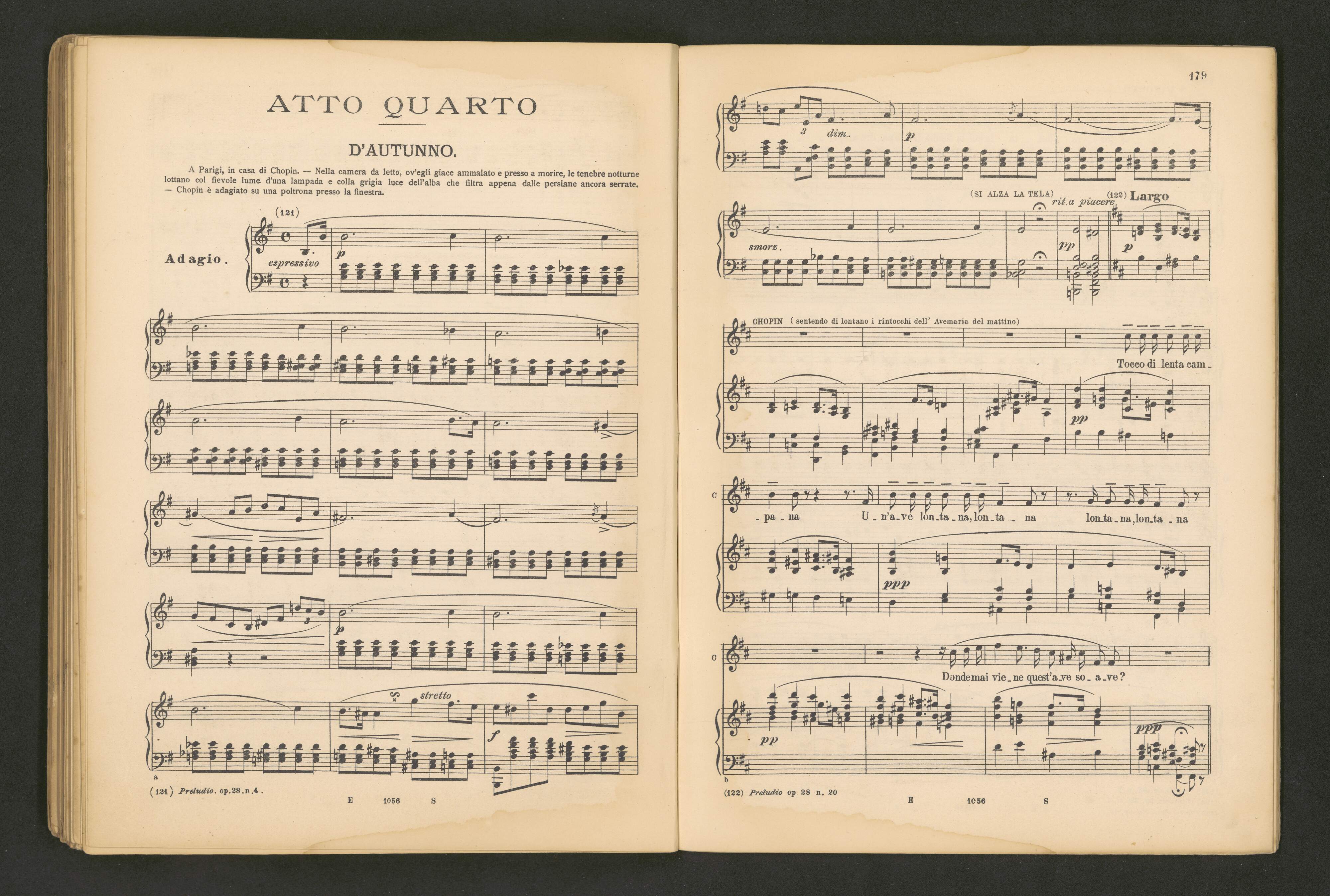 Chopin | Opera in 4 atti composta da | GIACOMO OREFICE | sulle melodie di F. Chopin. | Versi di ANGIOLO ORVIETO. | Canto e Pianoforte | MILANO | Edoardo Sonzogo, Editore | 14 - Via Pasquirolo - 14. | "Entered according to the Act of Congress, in the year 1901 by EDOARDO SONZOGNO, Editore | in the office of the Librarian of Congress at Washington."