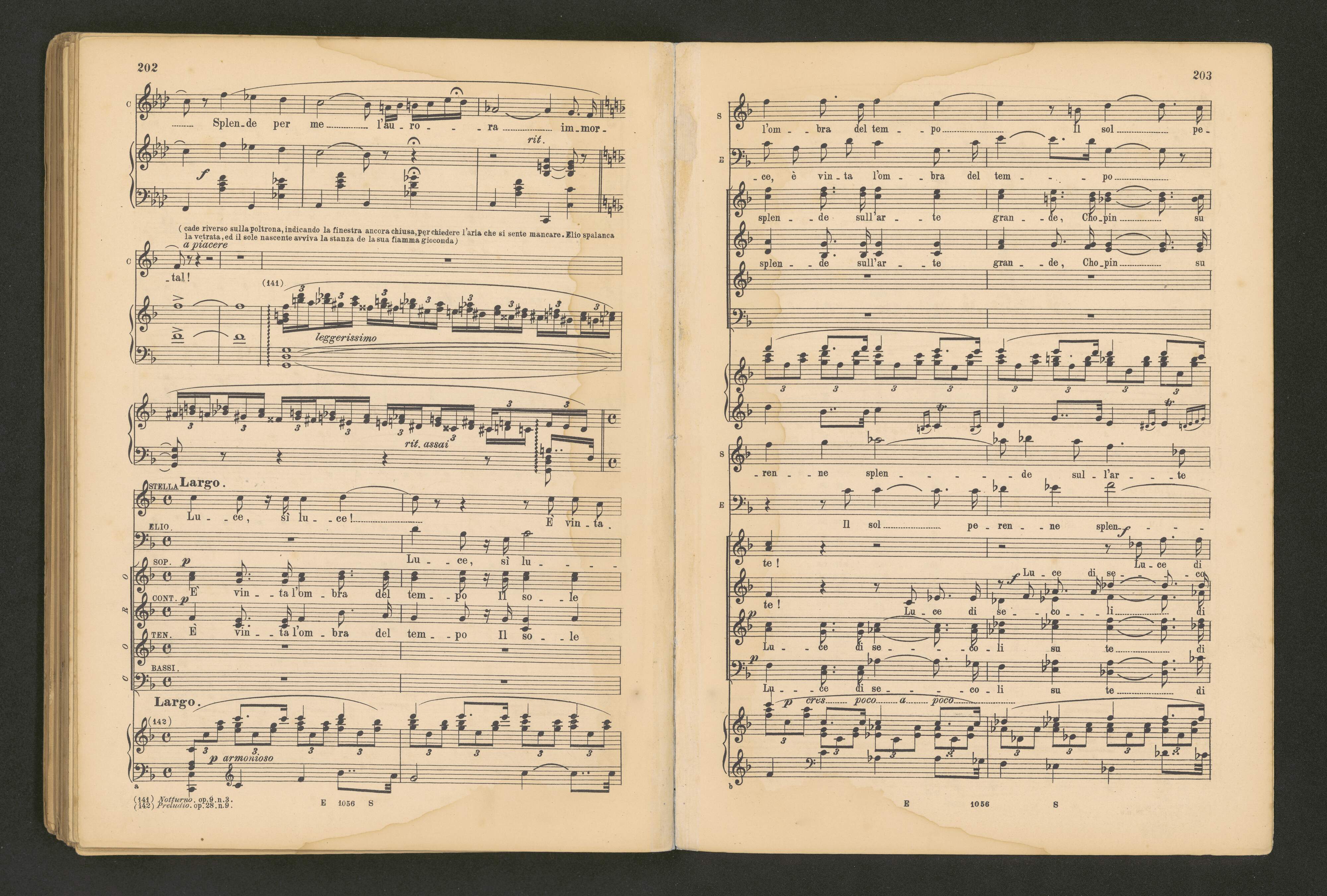 Chopin | Opera in 4 atti composta da | GIACOMO OREFICE | sulle melodie di F. Chopin. | Versi di ANGIOLO ORVIETO. | Canto e Pianoforte | MILANO | Edoardo Sonzogo, Editore | 14 - Via Pasquirolo - 14. | "Entered according to the Act of Congress, in the year 1901 by EDOARDO SONZOGNO, Editore | in the office of the Librarian of Congress at Washington."