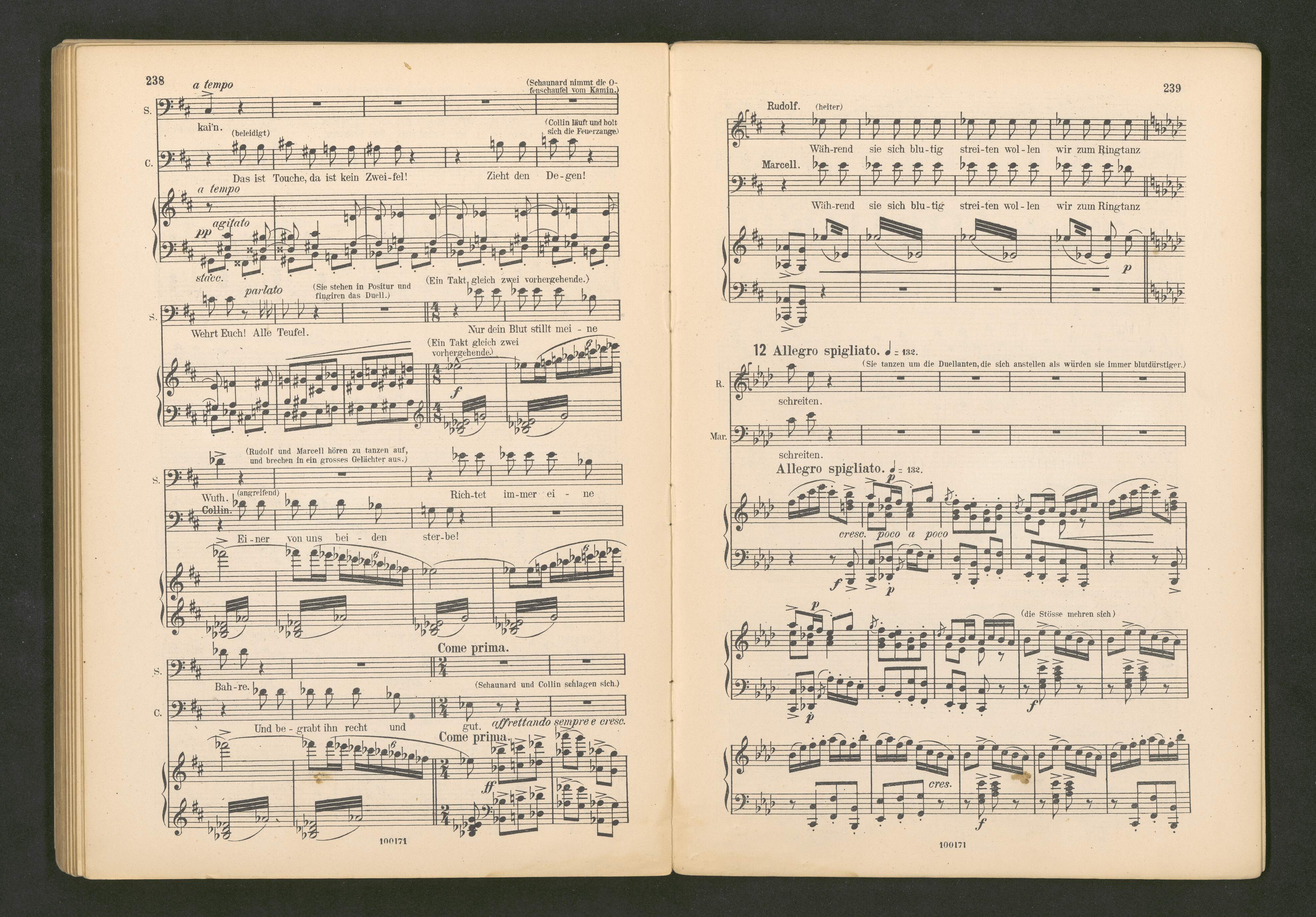 Die | Bohème | Scenen aus HENRY MURGERS "Vie de Boeme" | in vier Bildern | Musik| von | G. PUCCINI | [left:] Vlavierauszug mit Text: Mk. 12. | Pianoforte allein ,, 6. [right:] Eigenthum der firma | G. RICORDI & C. | fur alle Lander. | G. RICORDI & CO. | Musik-Verlag | Questr-16. | LEIPZIG | MAILAND-ROM-NEAPEL-PALERMO-PARIS-LONDON-BUENOS-AIRES | (Copyright 1897, by G. Ricordi & Co.) | (Printed in Italy)