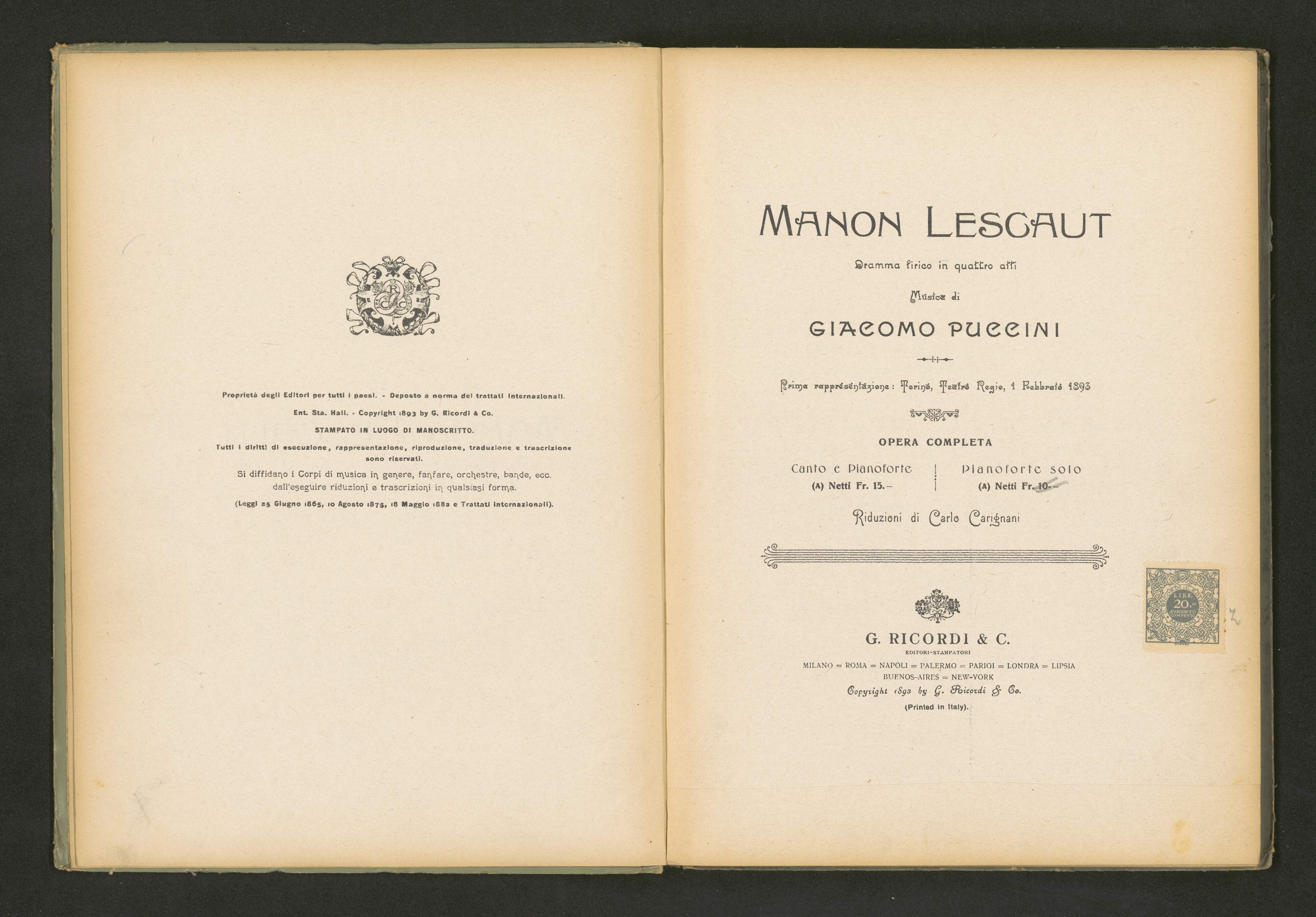G. PUCCINI | Manon | Lescaut | Dramma Lirico in 4 Atti | [left:] G. RICORDI & C. | EDITORI | Milano [right:] PIANOFORTE | SOLO | Copyright 1893 by G. Ricordi & Co. PRINTED IN ITALY IMPRIME EN ITALIE