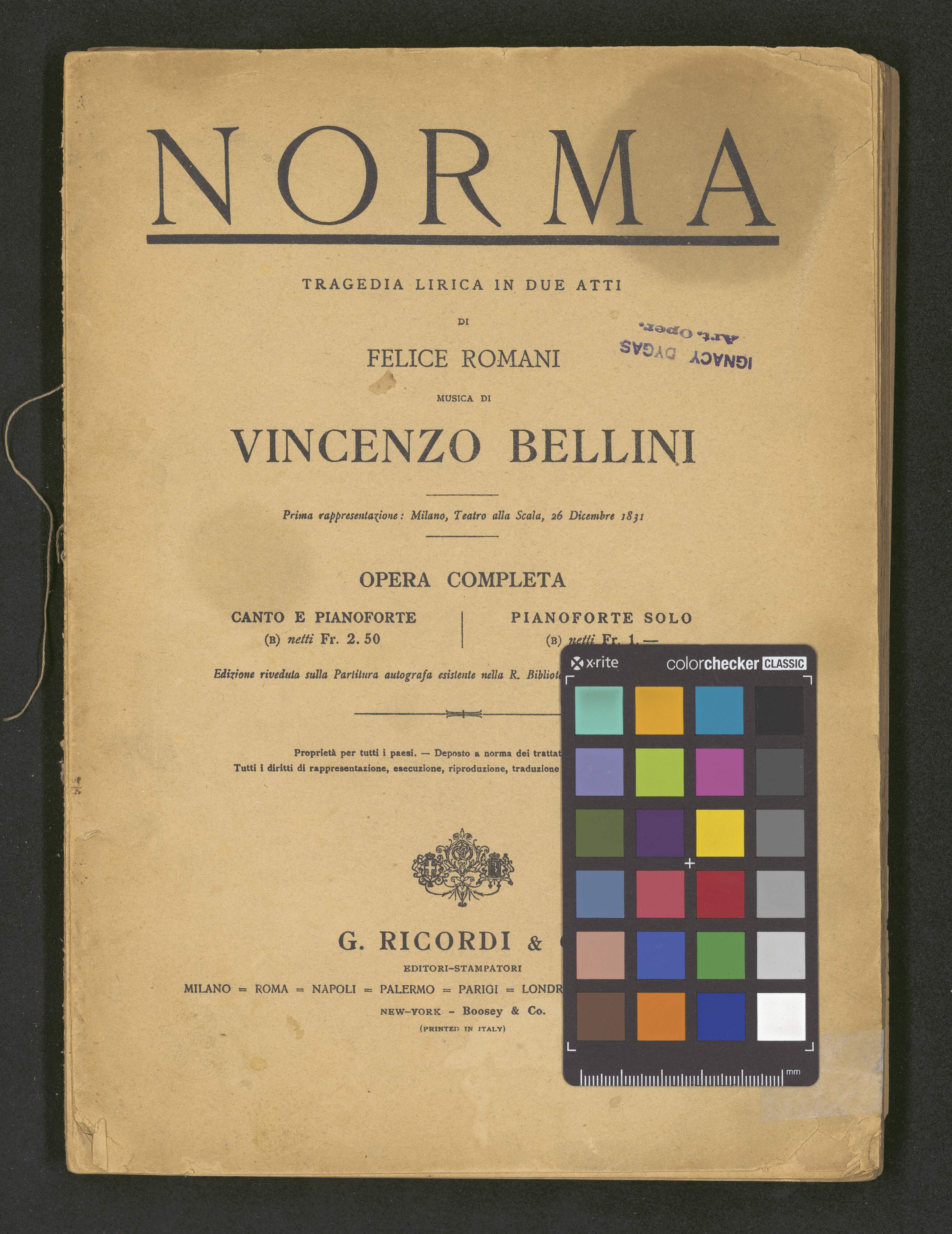 NORMA | TRAGEDIA LIRICA IN DUE ATTI | DI | FELICE ROMANI | MUSICA DI | VINCEZNO BELLINI | Prima rappresentazione: Milano, Teatro alla Scala, 26 Dicembre 1831 | OPERA COMPLETA | [left:] CANTO E PIANOFORTE | (B) netti Fr. 2.50 [right:] PIANOFORTE SOLO | (B) netti Fr. 1.- | Edizione riveduta sulla Partitura autografa esistente nella R. Biblioteca di Santa Cecilia di Roma | Proprieta per tutti i paesi. - Deposto a norma dei trattati internazionali. | Tutti i diritti di rappresentazione, esecuzione, riproduzione, traduzione e transcrizione zono riservati. | G. RICORDI & C. | EDITORI-STAMPATORI | MILANO = ROMA = NAPOLI = PALERMO = PARIGI = LONDRA = LIPSIA = BUENOS-AIRES | NEW-YORK - Boosey & Co. | (Printed in Italy)