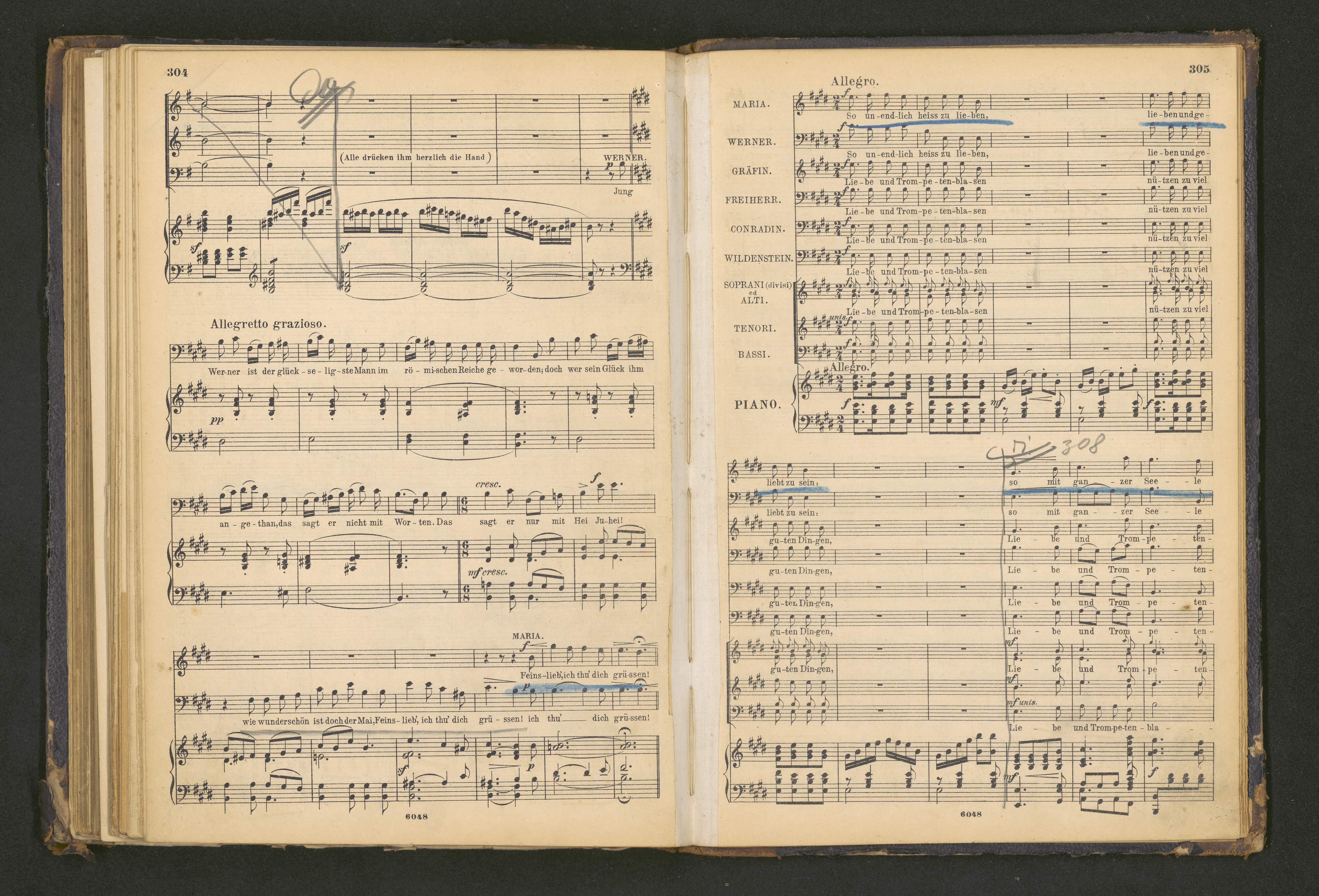 Der | Trompeter von Säkkingen | (The Trumpeter of Sackingen) | Oper in 3 Akten, nebst einem Vorspiel. | Mit autorisirtet theilweiser Benutzung der Jdee und einger Originallieder | aus | J. Victor von Scheffets Dichtung | von RUDOLF BUNGE. | Musik | von | Victor E. Nessler. | Eigenthum der Verleger. | J. Schuberth & C|o Leipzig. | New York Wm. A. Pond & C|o N|o 25 Union Square. | Copyright 1884 by Wm. A. Pond & C|o | All right reserved. | Entered Stationers Hall. London. | Lith. Anst. v. F. W. Garbrecht's Nachf. Oscar Brandstetter, Leipzig
