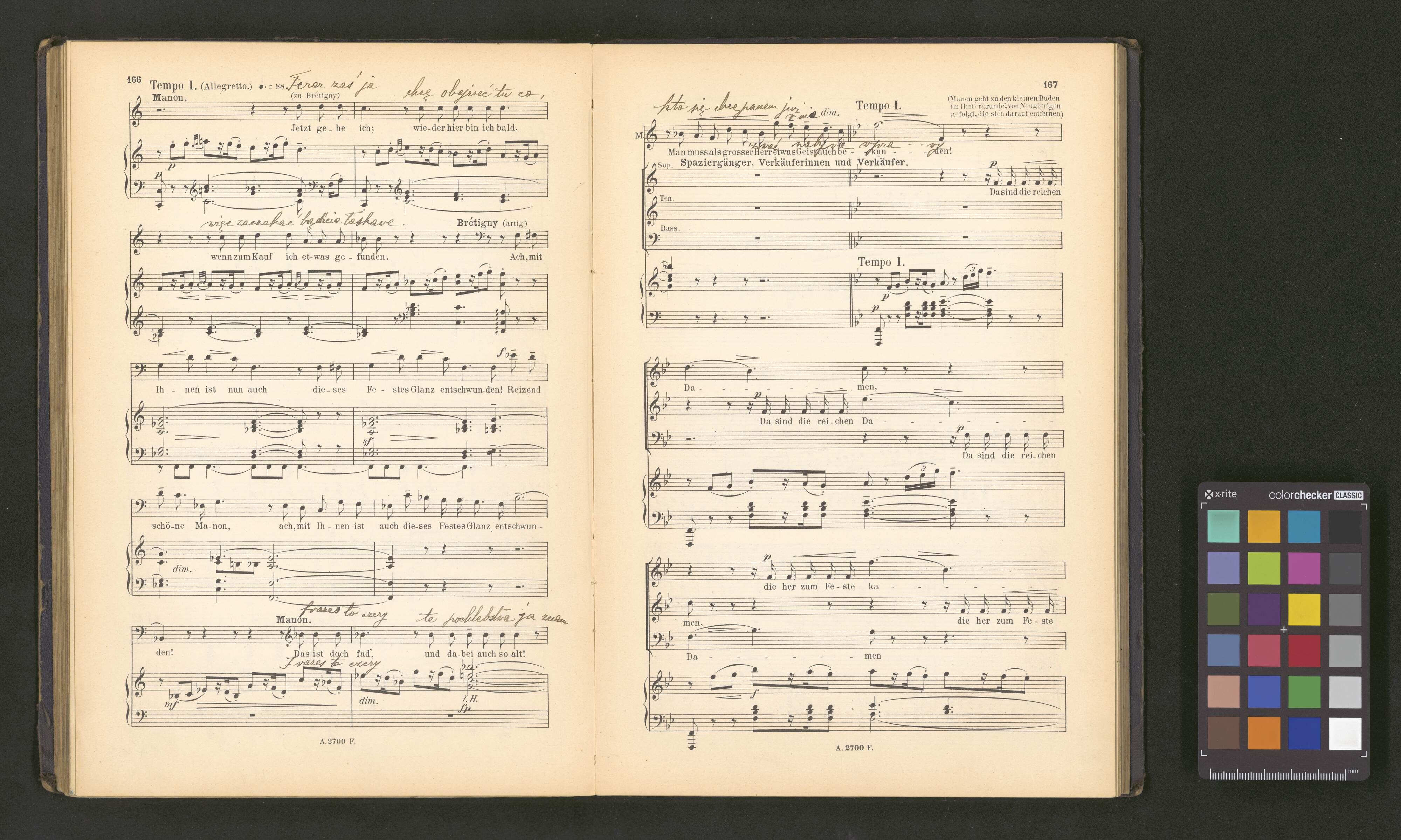 MANON. | OPER | in 4 Akten und 6 Bildern | Text von | HENRI MEILHAC & PHILIPP GILLE | Musik von | J. MASSENET. | Deutsch von FERDINAND GUMBERT. | [pricing index for particular issues] | Eigenthum des Verlegers | BERLIN, | ADOLPH FÜRSTNER | (.C.F. Meser) Königl. Sachsische Hof-Musikhandlung | PARIS, HEUGEL & C|i|e | Eigenthumer fur alle Lander ausser Deutschland und der oestrung Monarche | Alle Rechte vorbehalten | Das Vorrecht der Herausgabe im Altgemeinen und fur bestimmte Instrumente oder Orchester | ist fur die k. k. oestr. Staaten nach dem Patent de dto 16 Febr. 1846 vorbehalten | In Frankreich verbotene Ausgabe. | Lith. Anst. v. C. G. Röder, Leipzig