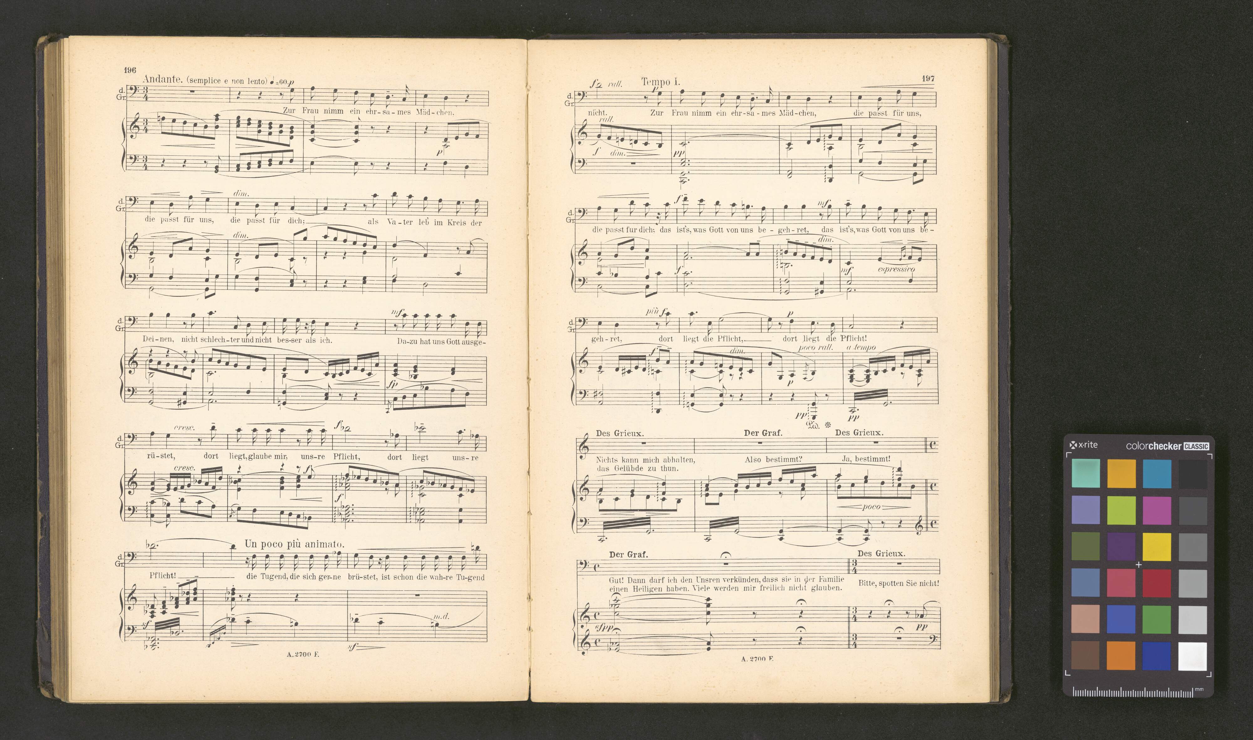 MANON. | OPER | in 4 Akten und 6 Bildern | Text von | HENRI MEILHAC & PHILIPP GILLE | Musik von | J. MASSENET. | Deutsch von FERDINAND GUMBERT. | [pricing index for particular issues] | Eigenthum des Verlegers | BERLIN, | ADOLPH FÜRSTNER | (.C.F. Meser) Königl. Sachsische Hof-Musikhandlung | PARIS, HEUGEL & C|i|e | Eigenthumer fur alle Lander ausser Deutschland und der oestrung Monarche | Alle Rechte vorbehalten | Das Vorrecht der Herausgabe im Altgemeinen und fur bestimmte Instrumente oder Orchester | ist fur die k. k. oestr. Staaten nach dem Patent de dto 16 Febr. 1846 vorbehalten | In Frankreich verbotene Ausgabe. | Lith. Anst. v. C. G. Röder, Leipzig