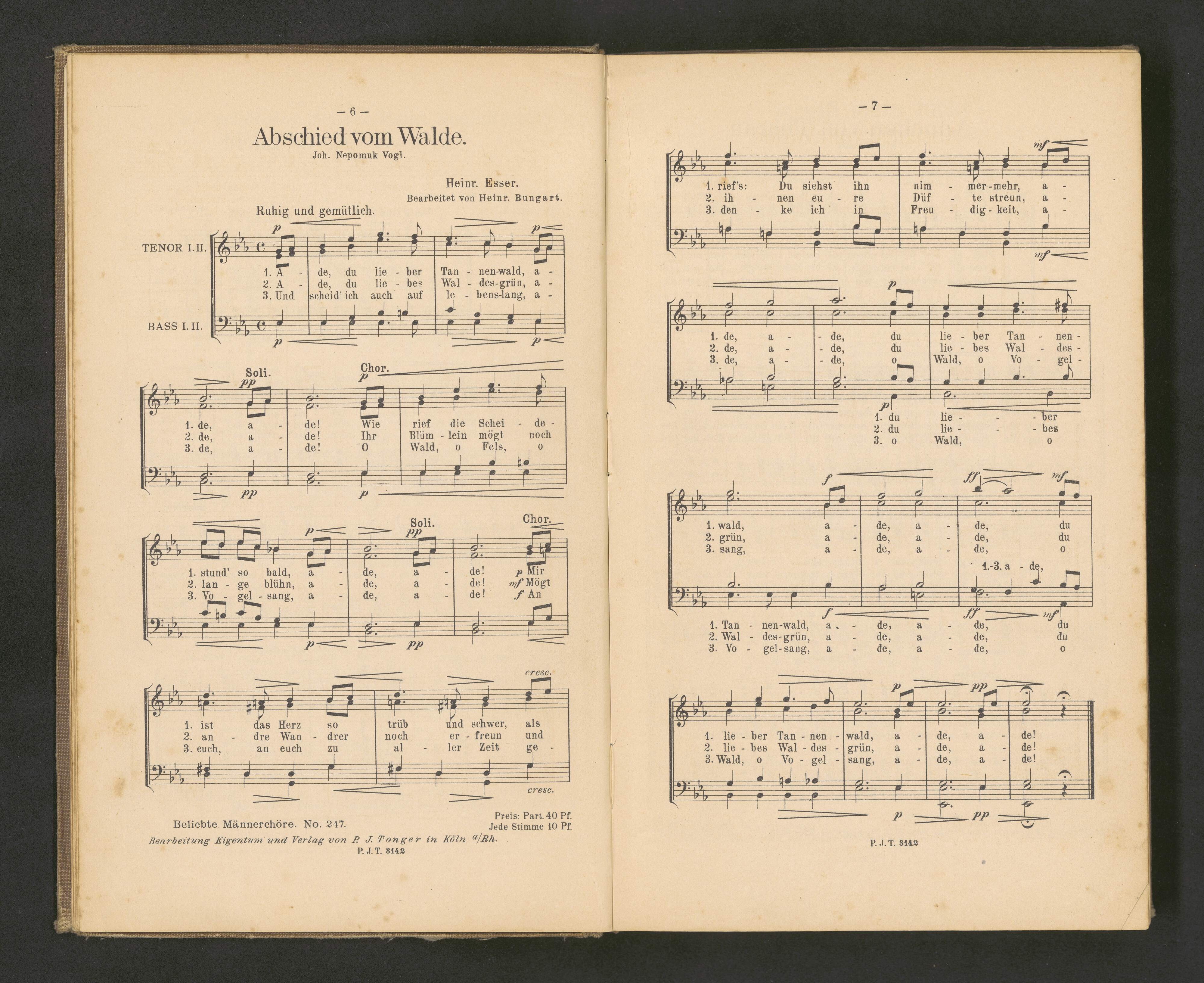 Tongers | Chorschatz | Band 2. | 200 | beliebteste aufführungsfreie | Volkslieder, volksstümliche Lieder und | Lieder im Volkston | für | 4 Männerchor. | bearbeitet von | Jos. Schwartz, Hugo Jüngst, Carl Schauss, | Heinr. Bungart u. a. | In Leinwand gebunden M. 2,- | Die Stimmen zu jedem Chor sind nur einzeln (nicht) | in Bandausgabe) zu den angeführten Preisen erhältlich; | auch kann jede Partitur einzeln nachbezogen werden. | Eigentum und Verlag von | P. J. TONGER, KÖLN a Rh. | Hofmusikalienhändler Sr. Majestät des Kaisers in KKönigs Wilhelm II