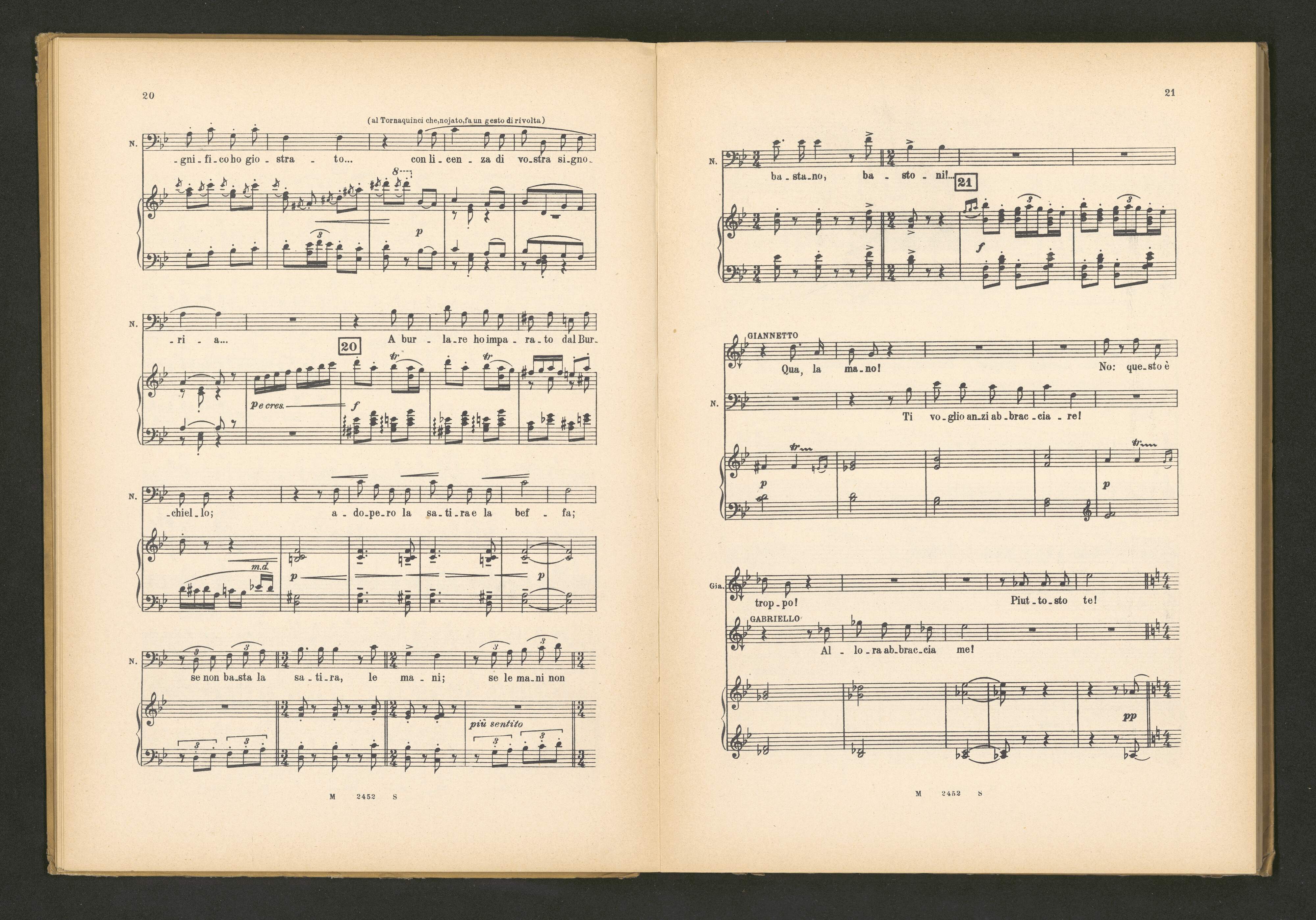 VMBERTO. GIORDANO. | LA.CENA.DELLE.BEFFE. | .POEMA .DRAMMATICO. | .IN.QVATTRO.ATTI. | .DI.SEM.BENELLI. | .RIDVZIONE.PER.CANTO.E.PIANOFORTE. | .DI.RAFFAELE.DELLI.PONTI. | .MILANO. | .SONZOGNO. MCMXXIV