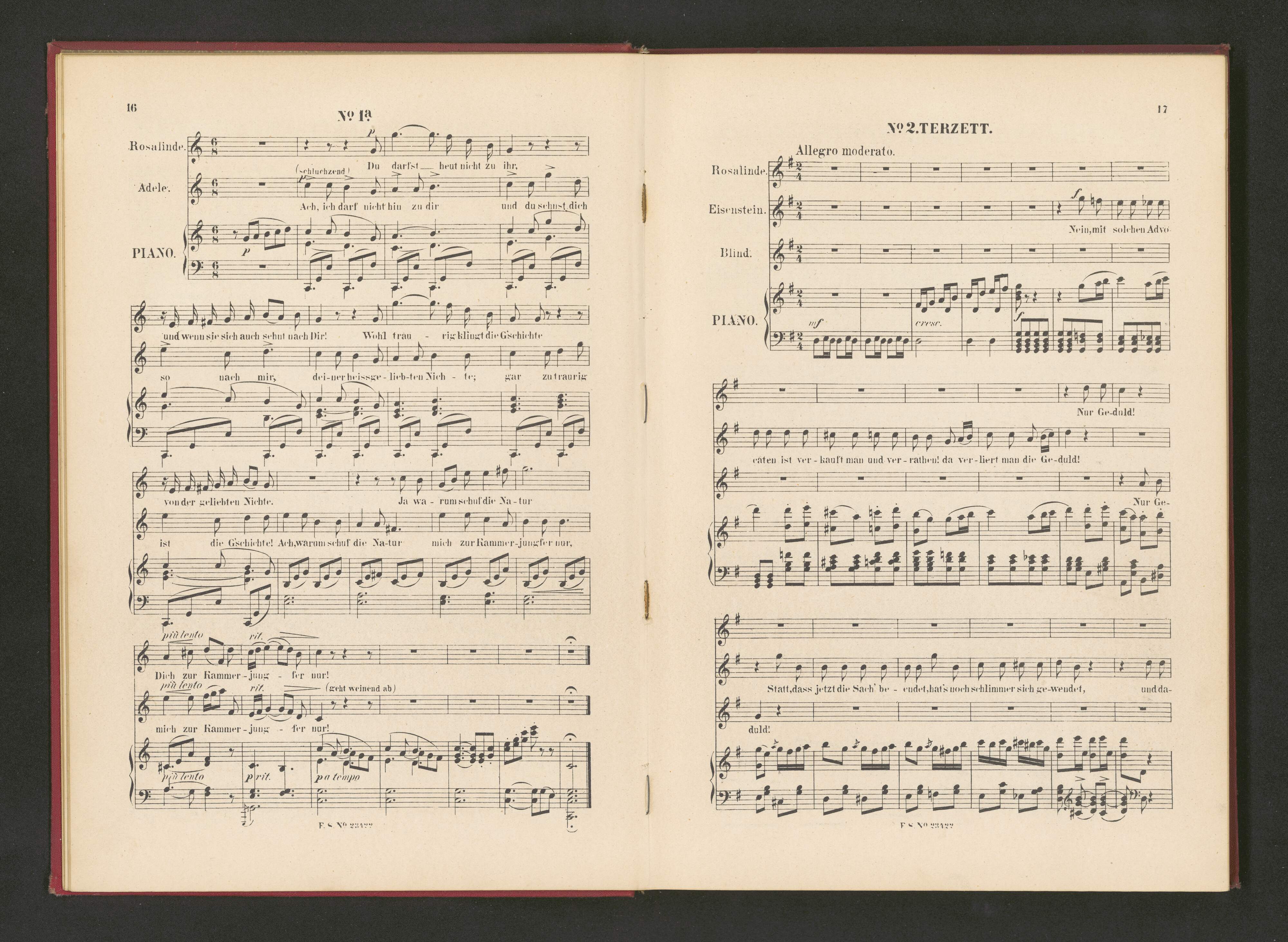 Die Fledermaus. | Operette in drei Acten. | Gesangs-Text von Richard Genée. | MUSIK | von | JOHANN STRAUSS, | K.K. Hofballmusik-Director. | [left:] Klavierauszug mit Text. | M.12._.netto. [right:] Klavierauszug ohne Text | M.4.50 neyyo. | Eigenthum der Verleger. | Tous droits de reproduction, d'execution, d'arrangements et de representtion reserves. | Alle Vervielfaltigungs-Arrangements-und Auffuhrungsrechte vorbehalten. | Leipzig, Aug, Cranz. | London, Cranz & C|o | Printed by C. G. Röder, Leipzig