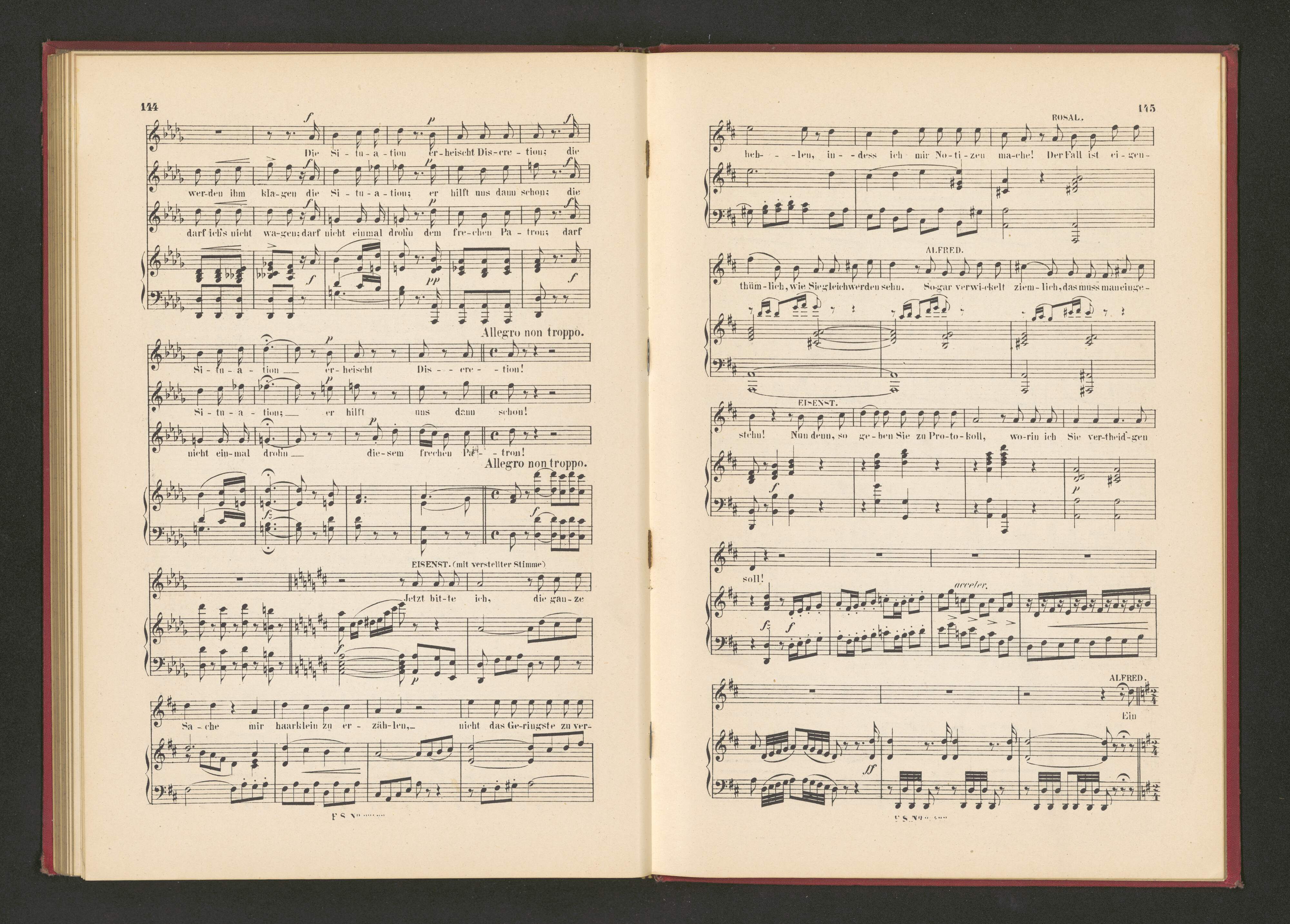 Die Fledermaus. | Operette in drei Acten. | Gesangs-Text von Richard Genée. | MUSIK | von | JOHANN STRAUSS, | K.K. Hofballmusik-Director. | [left:] Klavierauszug mit Text. | M.12._.netto. [right:] Klavierauszug ohne Text | M.4.50 neyyo. | Eigenthum der Verleger. | Tous droits de reproduction, d'execution, d'arrangements et de representtion reserves. | Alle Vervielfaltigungs-Arrangements-und Auffuhrungsrechte vorbehalten. | Leipzig, Aug, Cranz. | London, Cranz & C|o | Printed by C. G. Röder, Leipzig