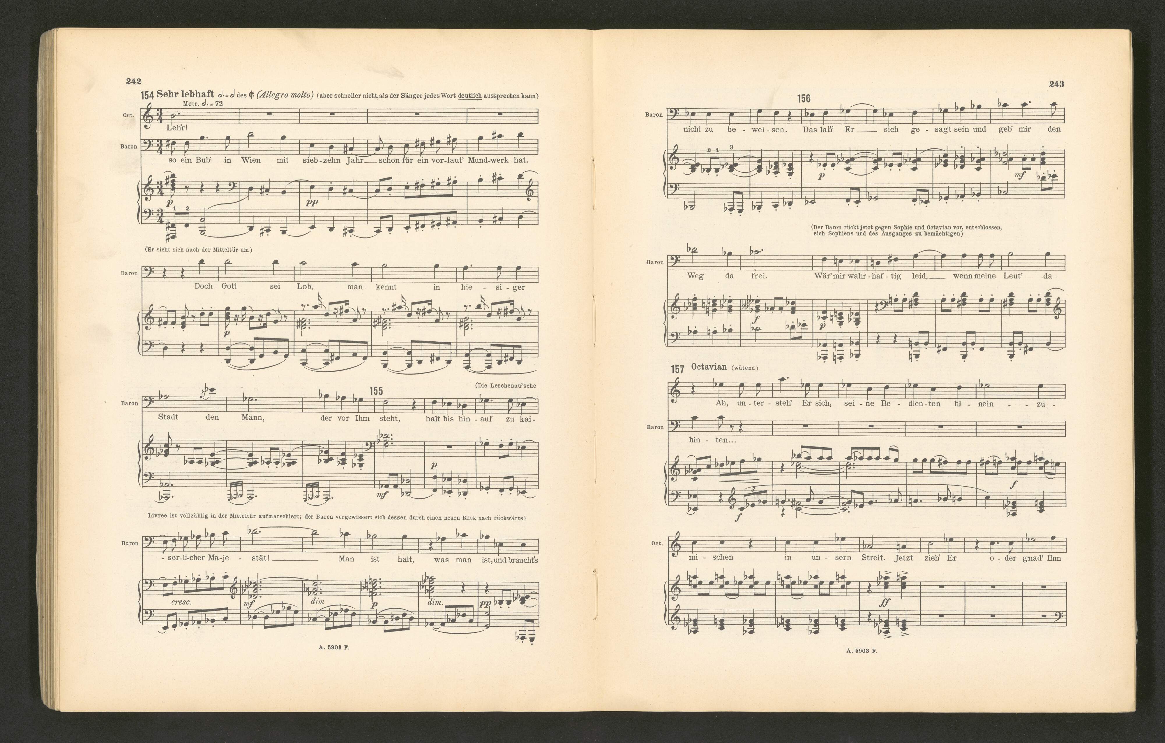 Der | Rosenkavalier | Kömodie für Musik von Hugo von Hofmannsthal. | Musik von | Richard Strauss | Op. 59 | Arrangement von Otto Singer. | Vollstandiger Klavier-Auszug mit deutschen Text | Verlag und Eigenthum für alle Lander | Adolph Fürster, Berlin-Paris. | Sole Agents for Great Britain, the English Colonies and Dependencies, and the United States of America | Chapell & Co., Ltd., 50, New Bond Street, London, W., | New York and Melbourne. | Tous droits d'execution, de representation, de reproduction, de traduction, d'ar= | rangements reserves pour tous pays y compris la Suede, la Norwege et le Danemark | Copyright including right of performance 1911 by Adolph Fürster. | A. 5903 F