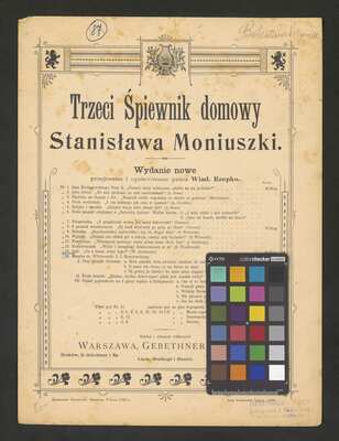 Trzeci Śpiewnik domowy | Stanisława Moniuszki. | Wydanie nowe | przejrzane i opracowane przez Wład. Rzepko. | [list of compositions in series] | Nakład i własność wydawców | WARSZAWA GEBETHNER I WOLFF |Kraków, G.Gebethner i Sp. | Lipsk, Breitkopf i Haertel. , Kijów, L. Idzikowski | Oscar Brandstetter, Leipzig, Luli V, pf G