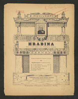 [title page:] HRABINA | Opera w trzech aktach, słowa Włodzimierza Wolskiego. | MUZYKĘ NAPISAŁ | Stanisław Moniuszko | Wyciąg fortepianowy do śpiewu ... R. 10 net. | Wyjątki do śpiewu w oryginalnej tonacyi. | N|o 6. Arya Kazimierza ... kop. 70 | N|o 7. Duet (Hrabina, Kazimierz) ... ,, 70 | N|o 11. Arya włoska ... 60 | N|o 18(19|a). Arya Kazimierza ... ,, 90 | N|o 23. Śpiew Hrabiny (Sopran) ... ,, 30 | Wydawnictwo Sekcyi imienia Stanisława Moniuszki przy Towarzystwie Muzycznem w Warszawie. | Warszawa | Gebethner i Wolff | Kraków G. Gebethner i Spółka, [heading, p. 2:] N|o 23. Śpiew Hrabiny, Arias V, pf Arr, Hrabina Excerpts Arr