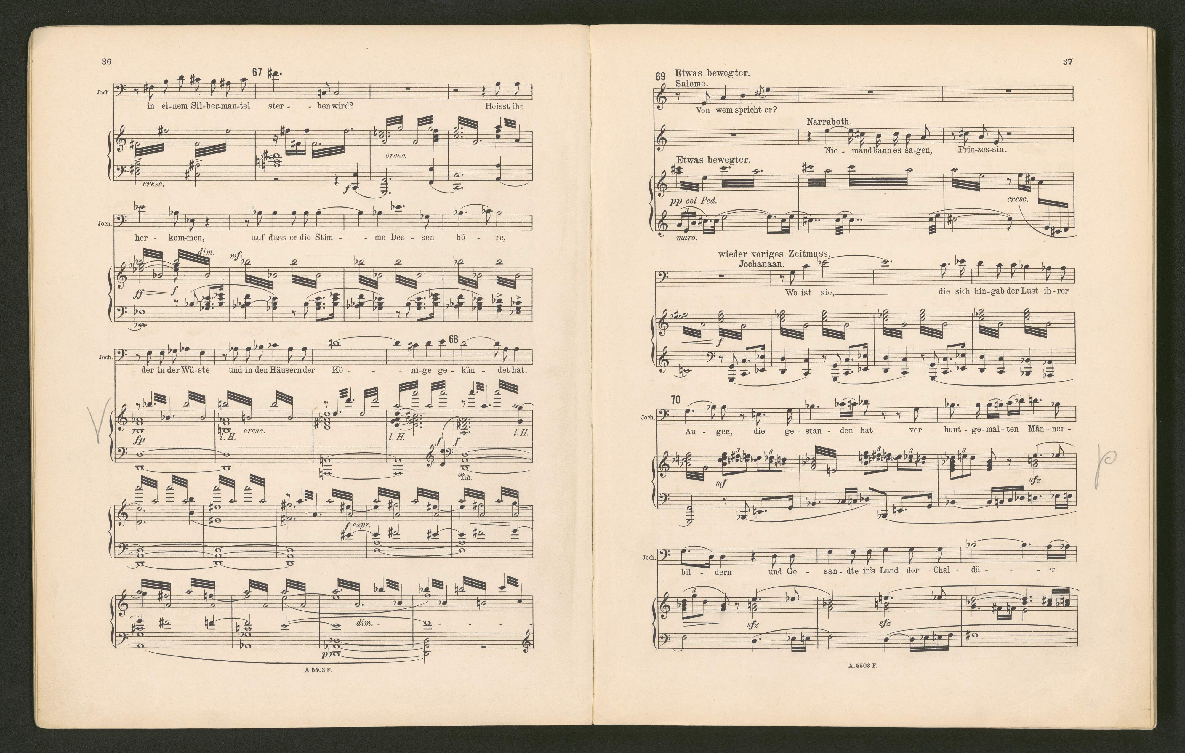 [title page:] Das Recht der Aufführung ist vorbehalten. | DR. RICHARD STRAUSS. | Meinem Freunde EDGAR SPEYER. | SALOME. | Drama in einem Aufzuge | nach OSCAR WILDE'S gleichnamiger Dichtung | in deutscher Übersetzung von Hedwig Lachmann. | Musik | von | RICHARD STRAUSS. | Op. 54. | Klavier-Auszug mit Text | von | OTTO SINGER. | Preis M. 16. - netto. | Eigentum des Verlegers für alle Länder. | BERLIN W. | ADOLPH FÜRSTHNER. | Alle Rechte vorbehalten. | Copyright including Right of Performance 1905 by Adolph Fürstner. | A. 5503 F. | C. G. Röder G. m. b. H., Leipzig. 3015. 05